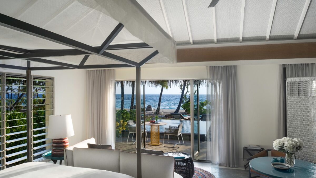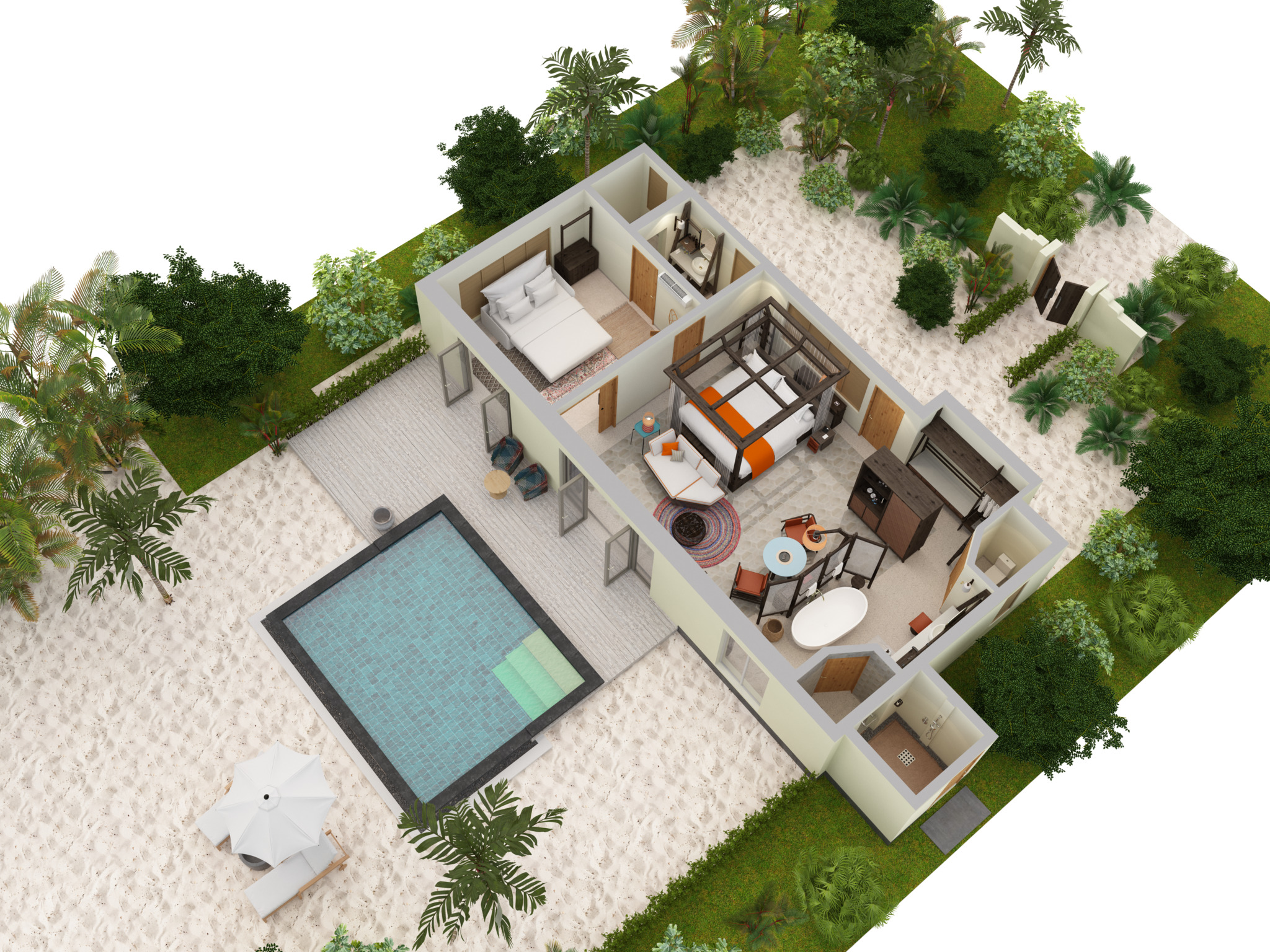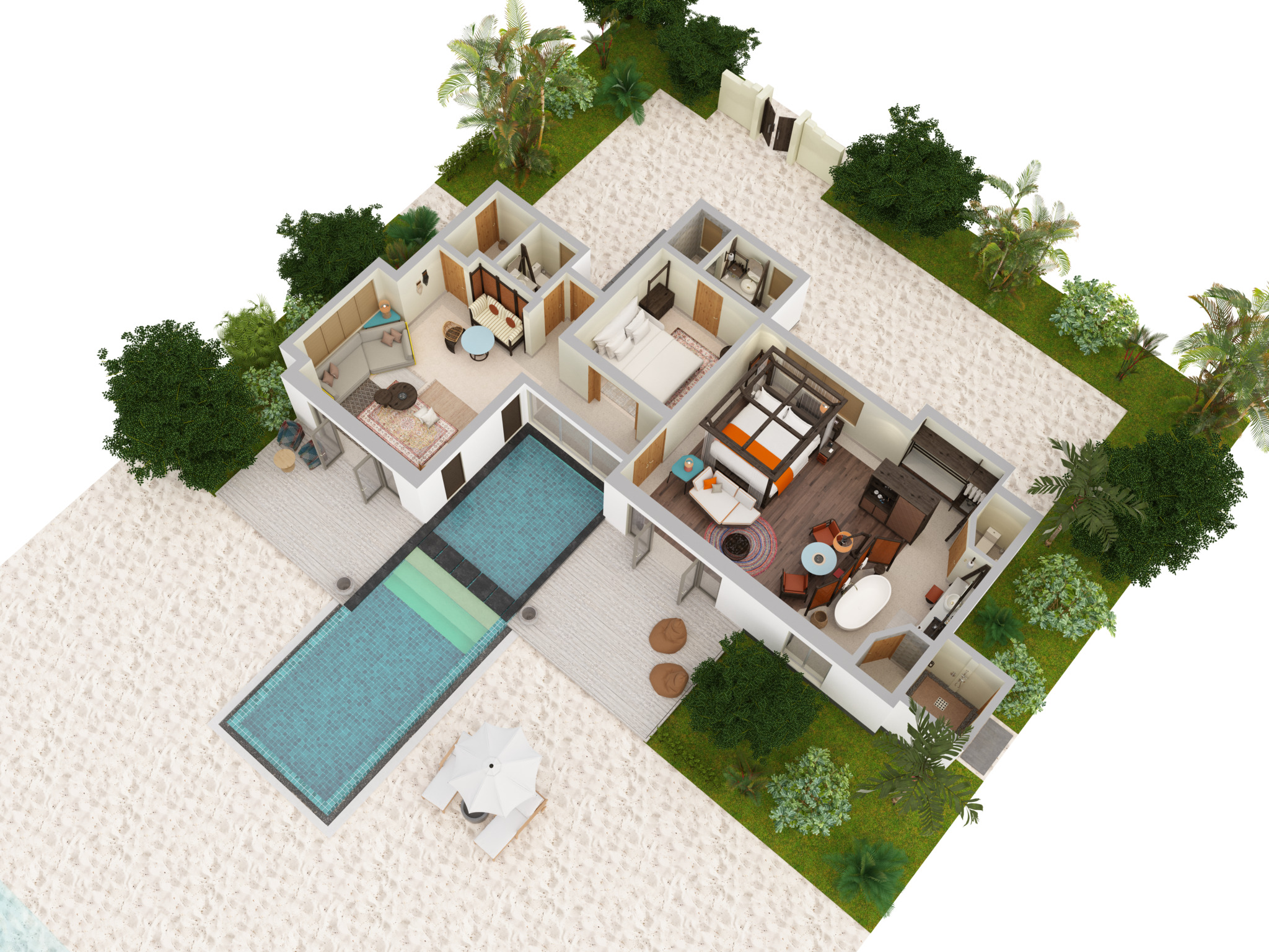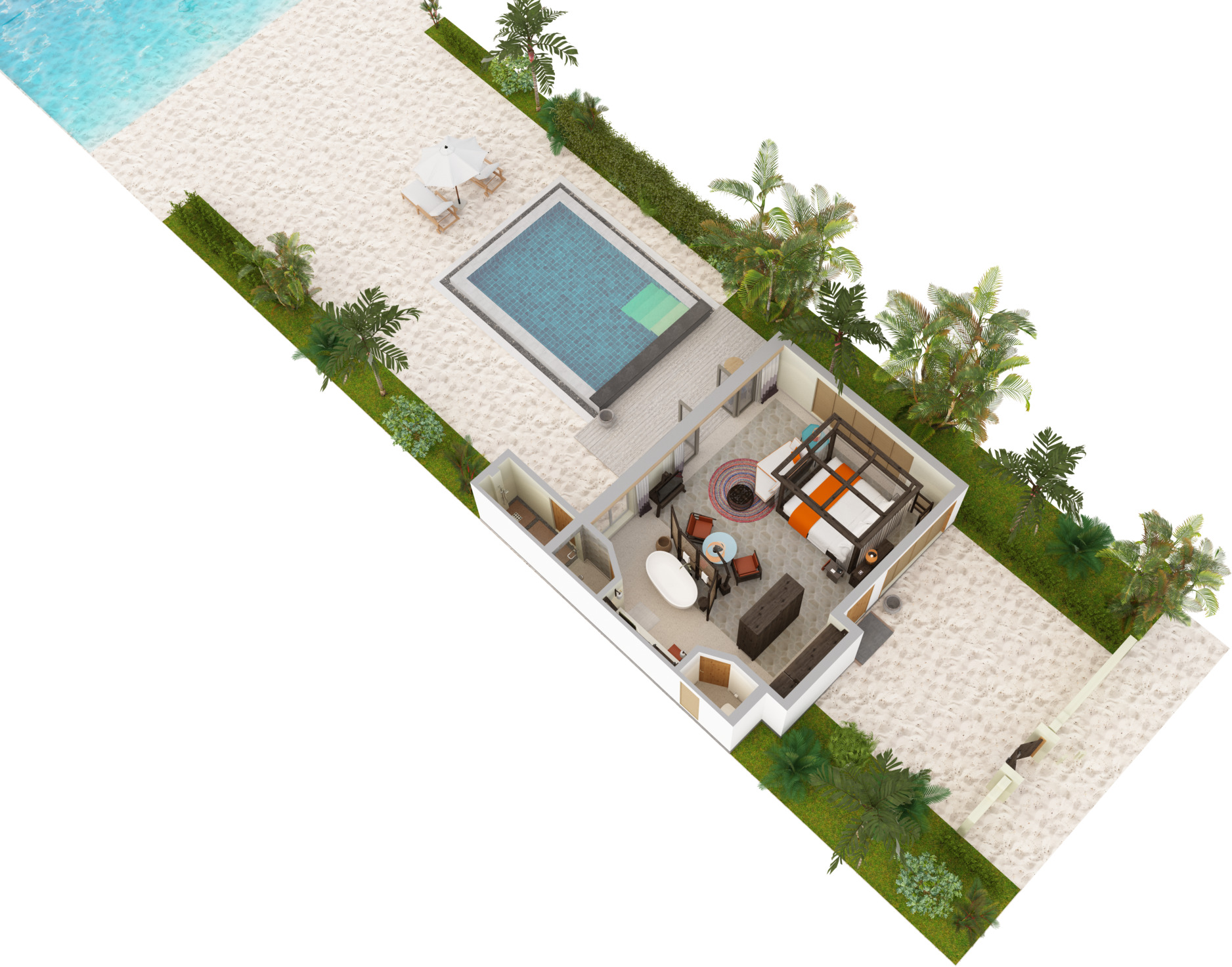 Пляжные виллы, спальня с двуспальной кроватью king-size (спальня открытой планировки, нет двери между спальней и ванной комнатой), ванна и душ, гостиная комната с диваном, гостевой туалет, небольшой кухонный уголок, душ под открытым небом, терраса, персональный бассейн, прямой выход на пляж, вид на закат, см. план номерасм. виртуальный тур;