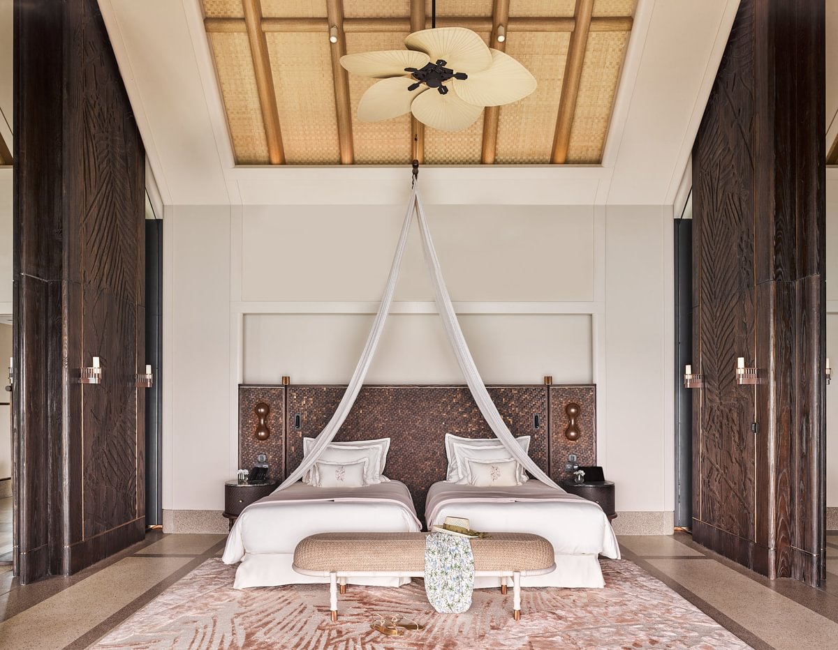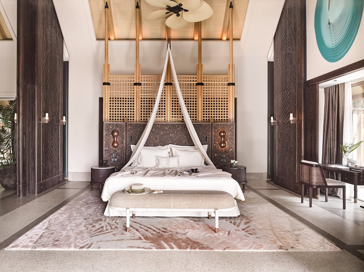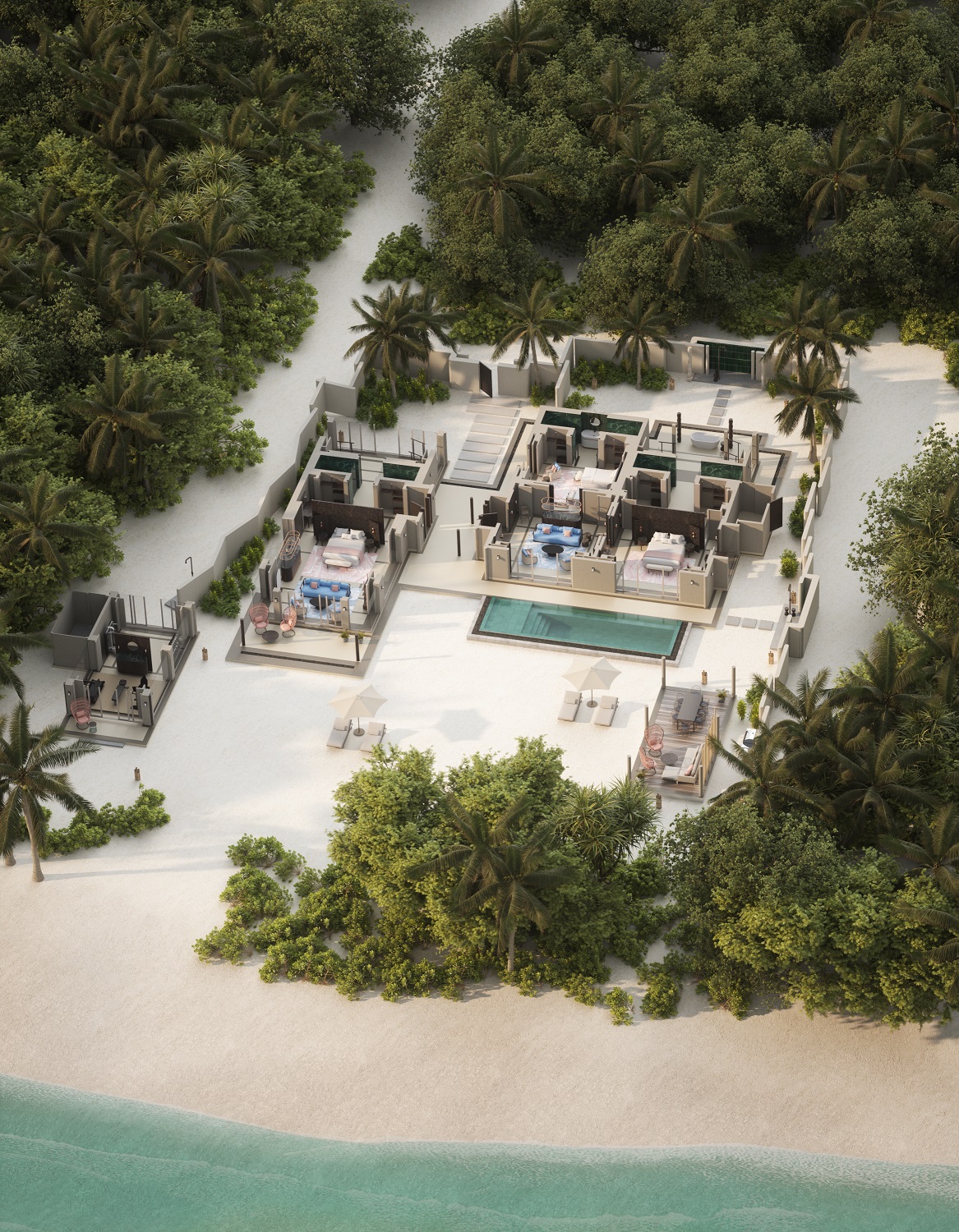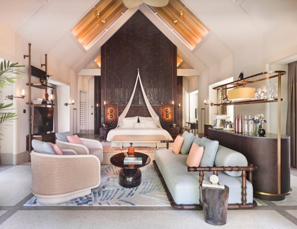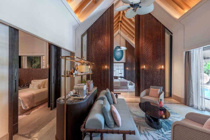Расположены рядом с пляжем, частный сад, открытый бассейн infinity (35 м²), двуспальная кровать king-size или 2 односпальные кровати, гостиная зона с диваном и креслами, терраса, гардеробная, ванная комната с ванной, душ на открытом воздухе, вид на пляж и океан, услуги дворецкого, план номера;