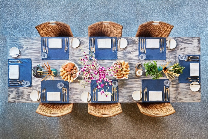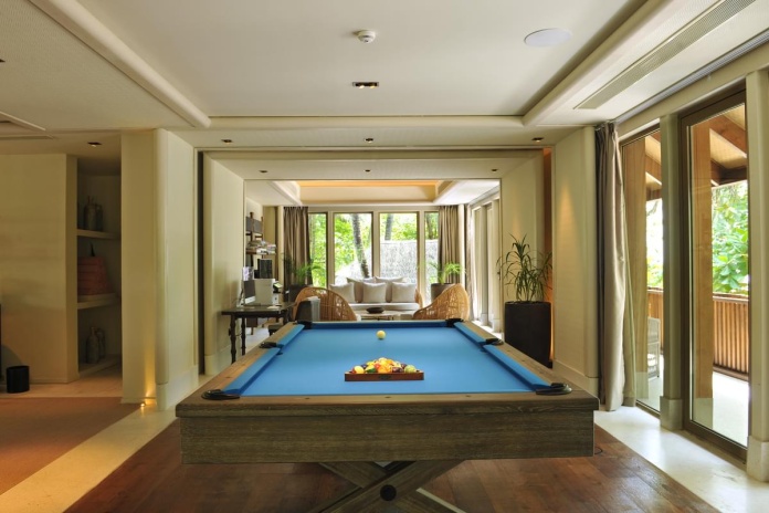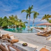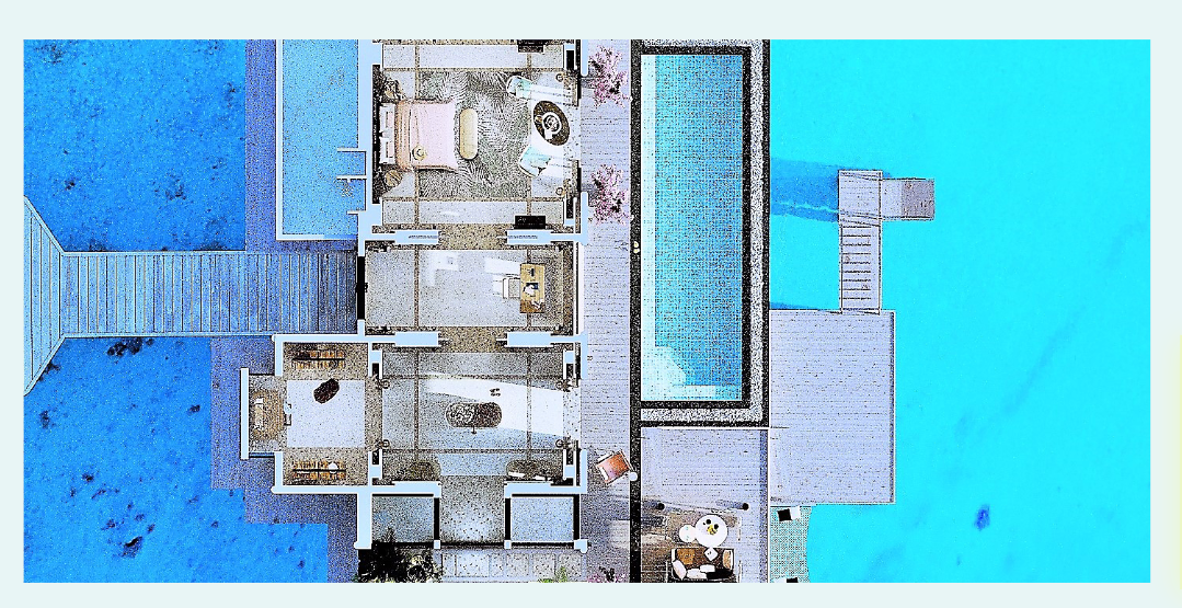 Расположена на сваях над водой, 3 спальни, 2 гостиные комнаты, 2 бассейна infinity, 3 гардеробные, 3 ванные комнаты с ванными, душ под открытым небом, меблированная терраса, прямой спуск в воду, комната для спа процедур, услуги дворецкого, панорамный вид на океан, план номера;
