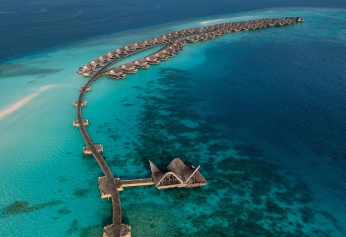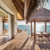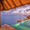 Расположены на сваях над водой, вид на закат, терраса с открытым персональным бассейном 35 м² и лежаками, спальня с кроватью king-size или 2 односпальными кроватями, гостиная зона с креслами, отдельная рабочая зона с письменным столом, гардеробная, ванная комната с ванной, душ на открытом воздухе, прямой спуск в воду, услуги дворецкого, план номера;