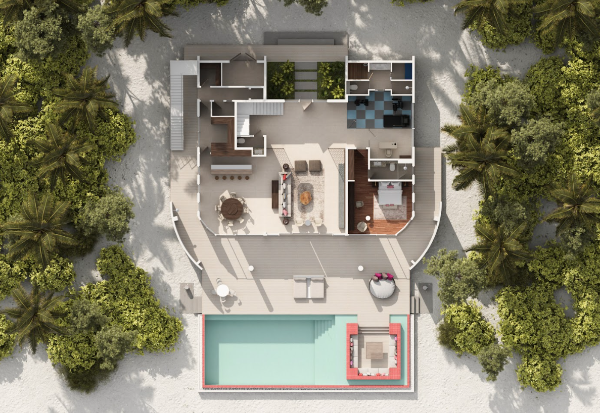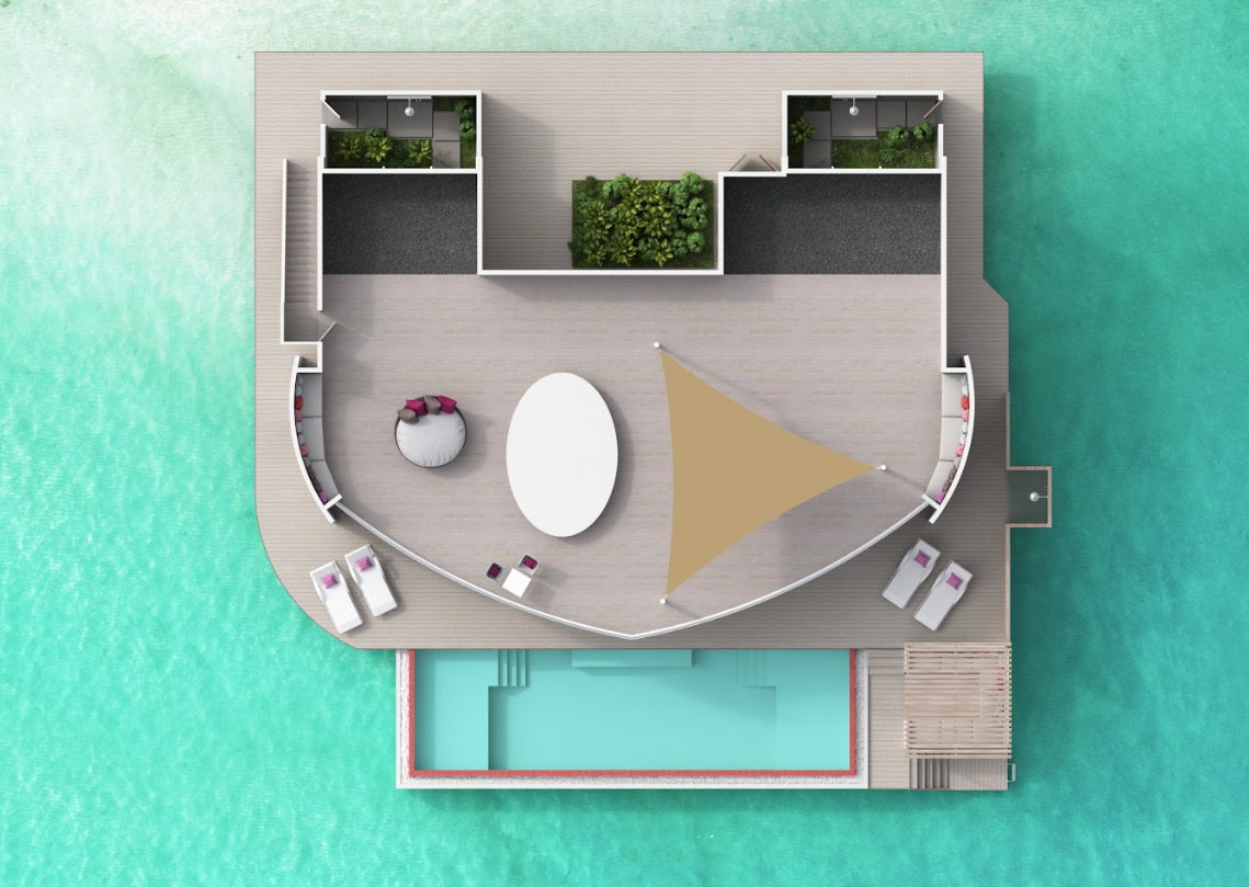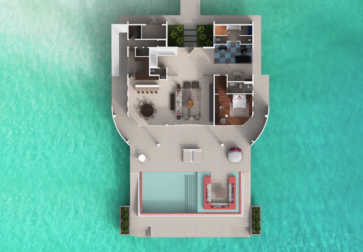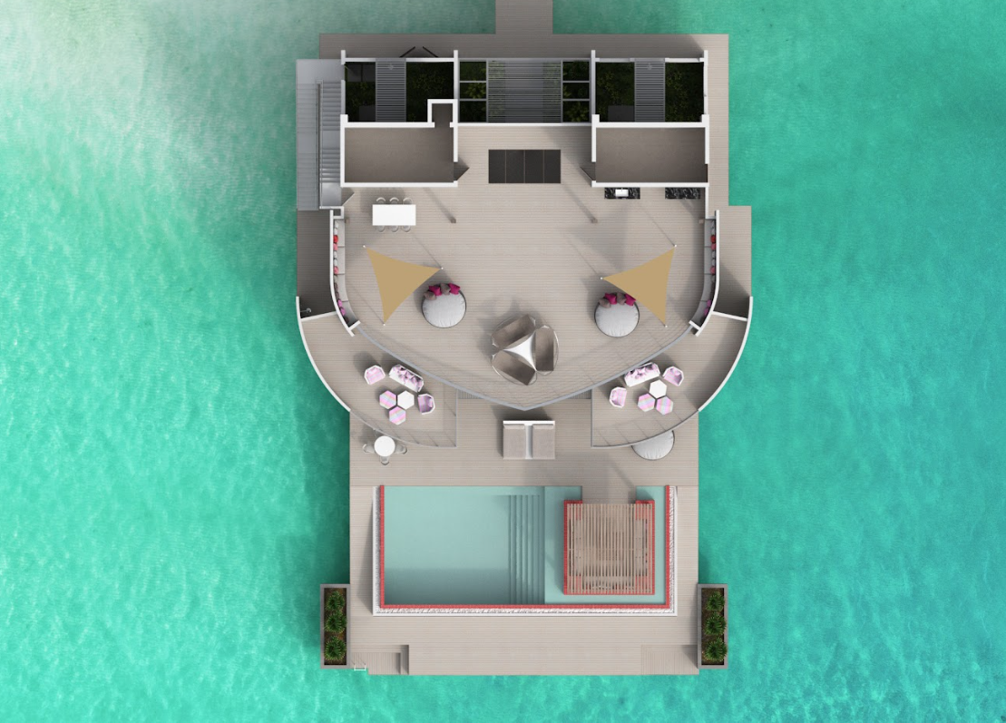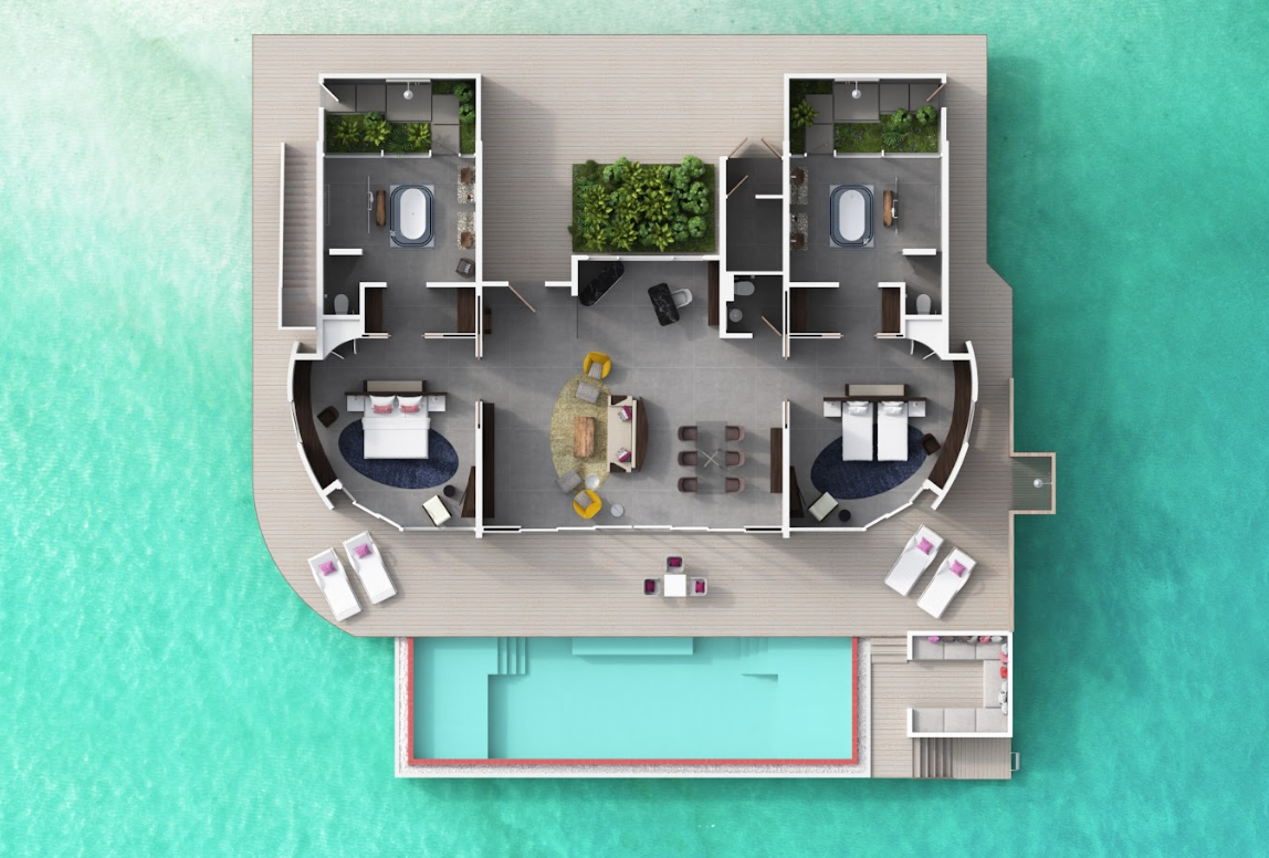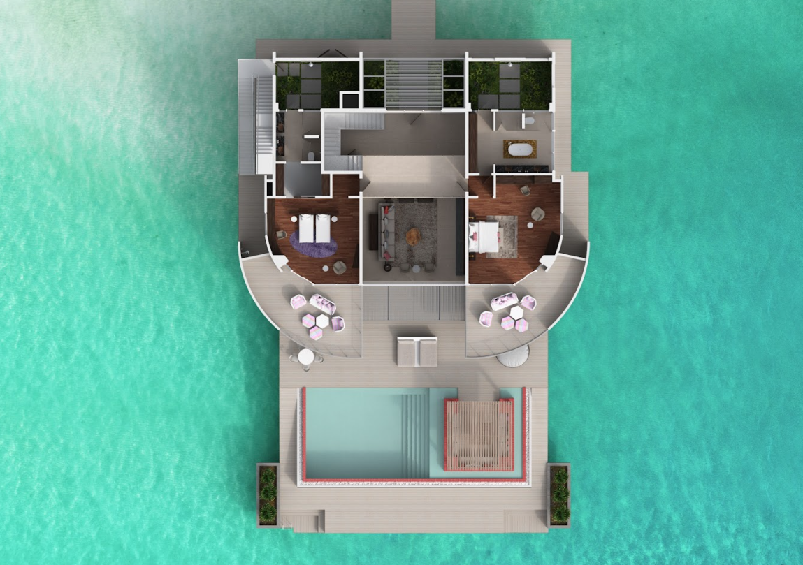 Расположены на сваях над водой, 2 спальни: двуспальная кровать king-size и 2 односпальные кровати, 2 ванные комнаты с ванной, 2 душа под открытым небом, гардеробная, отдельная гостиная комната с диваном, гостевой туалет, меблированная терраса с лежаками и персональным бассейном размера 14,3 х 4,2 х 1,2 м, меблированная терраса на крыше, вид на океан, прямой спуск в воду, см.план номера, план террасы на крыше;