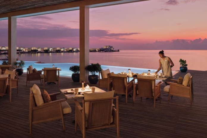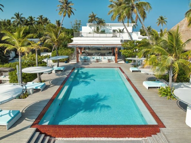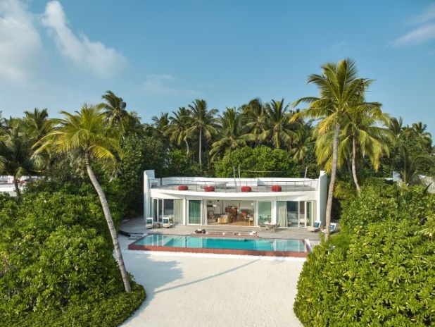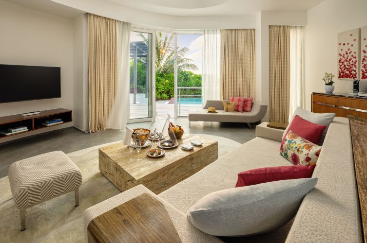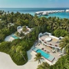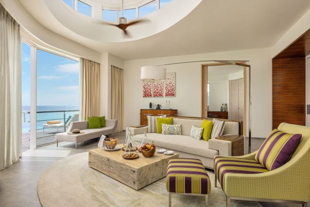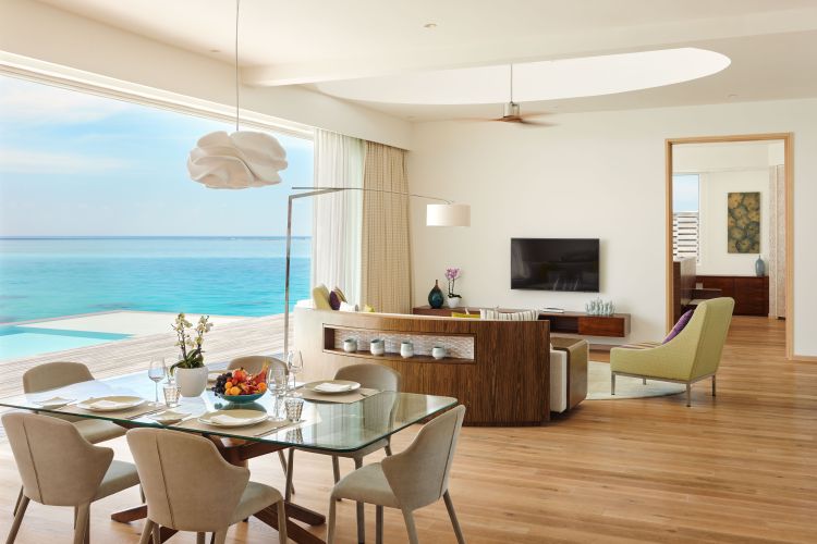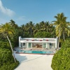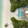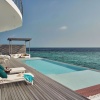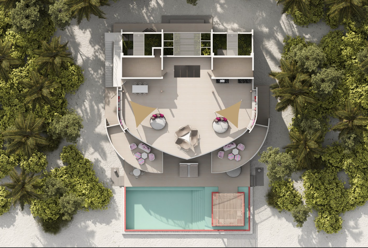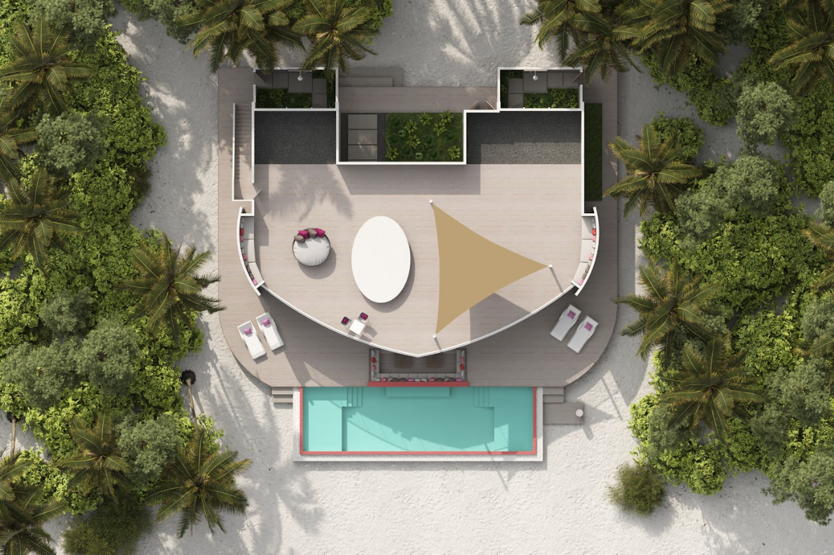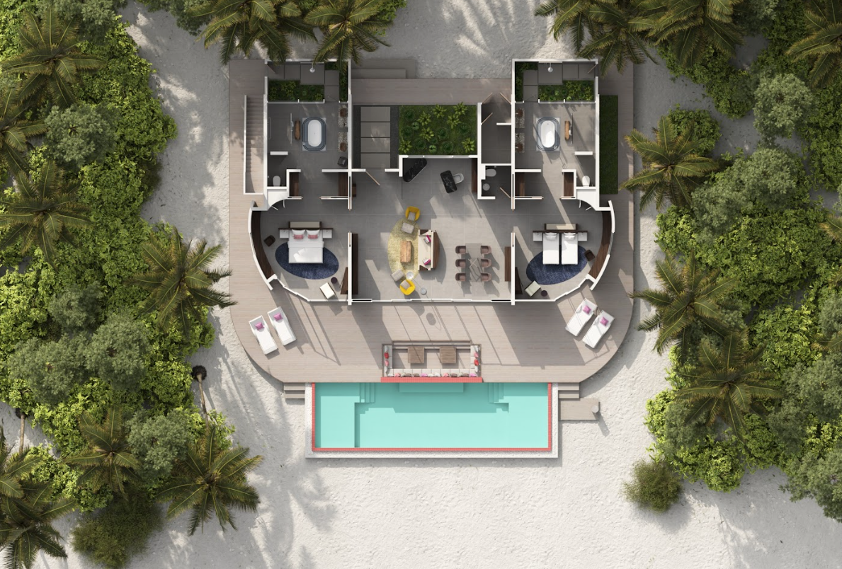 Расположены на сваях над водой, 2 спальни: двуспальная кровать king-size и 2 односпальные кровати, 2 ванные комнаты с ванной, 2 душа под открытым небом, гардеробная, отдельная гостиная комната с диваном, гостевой туалет, меблированная терраса с лежаками и персональным бассейном размера 14,3 х 4,2 х 1,2 м, меблированная терраса на крыше, вид на океан, прямой спуск в воду, см.план номера, план террасы на крыше;