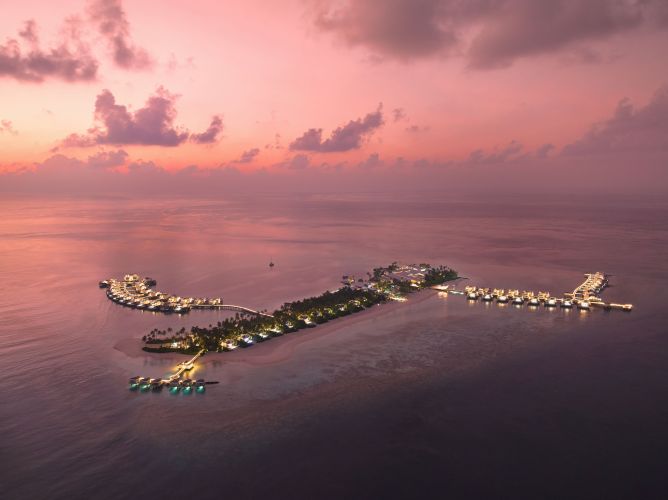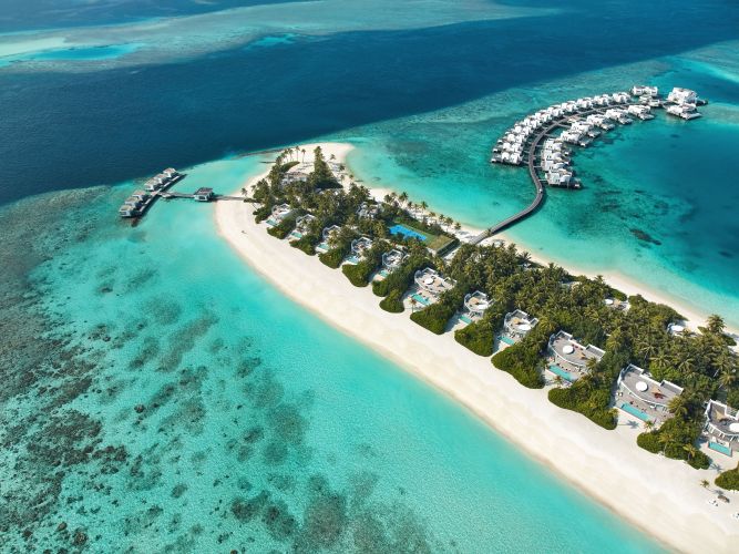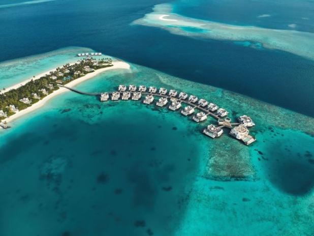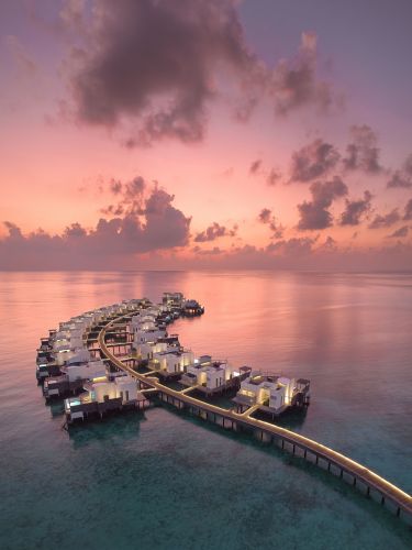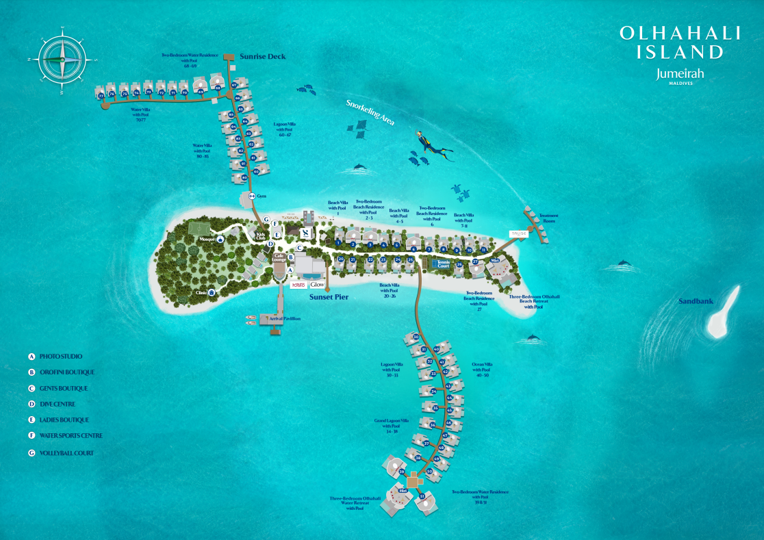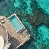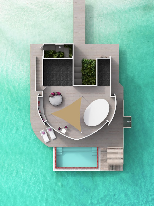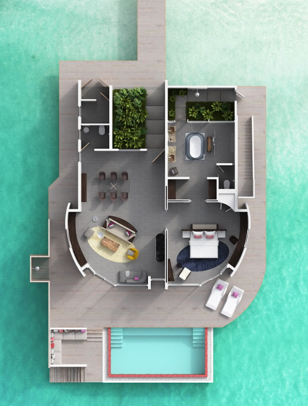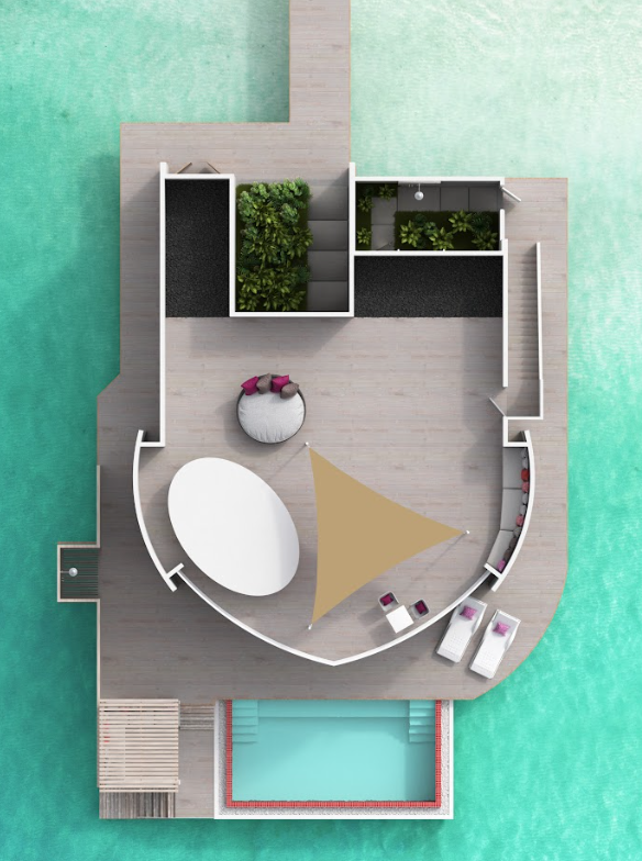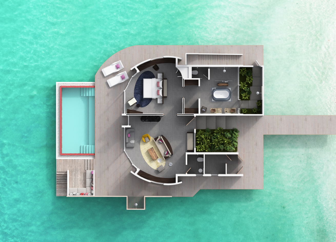 Расположены на сваях над водой по обе стороны острова, спальня с двуспальной кроватью king-size, отдельная гостиная комната с диваном, гардеробная, ванная комната с ванной, душем, внутренним двориком и душем под открытым небом, гостевой туалет, терраса с частным бассейном размером 7х3,5х1,2 м, душ на террасе, меблированная терраса на крыше, прямой спуск в воду, панорамный вид на океан, см.план номера, план террасы на крыше;