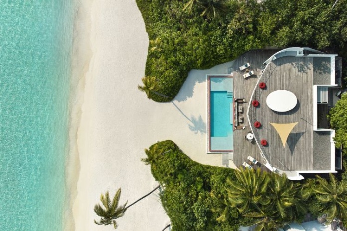 Береговая вилла, 2 спальни: двуспальная кровать king-size и 2 односпальные кровати, 2 ванные комнаты с ванной, 2 душа под открытым небом, гардеробная, отдельная гостиная комната с диваном, гостевой туалет, меблированная терраса с лежаками и персональным бассейном размера 14,3 х 4,2 х 1,2 м, меблированная терраса на крыше, вид на океан, прямой выход на пляж, см.план номера, план террасы на крыше;