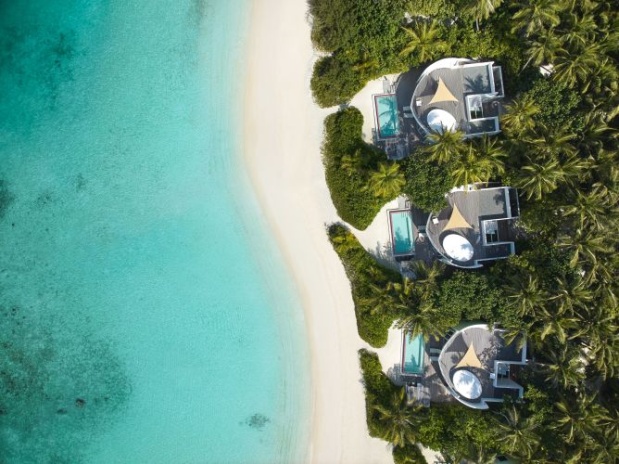 Расположены на сваях над водой, двухуровневый номер, 3 спальни: 2 двуспальные кровати king-size и 2 односпальные кровати, кабинет, отдельная гостиная комната с диваном, обеденным столом и мини-кухней, гостевой туалет, гардеробные и ванные комнаты, комната с тренажёрами, паровая баня, сауна, терраса, 2 душа под открытым небом на террасе, частный бассейн размера 18 х 6,3 х 1,2 м, меблированная терраса на крыше, прямой спуск в воду, вид на океан см.план номера 1 этаж, 2 этаж, 3 этаж.