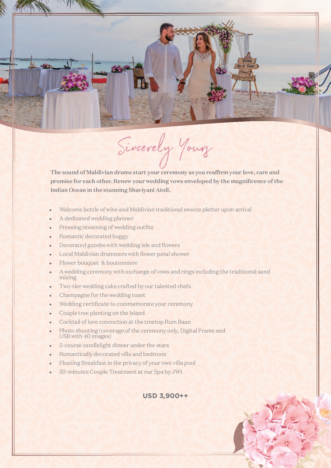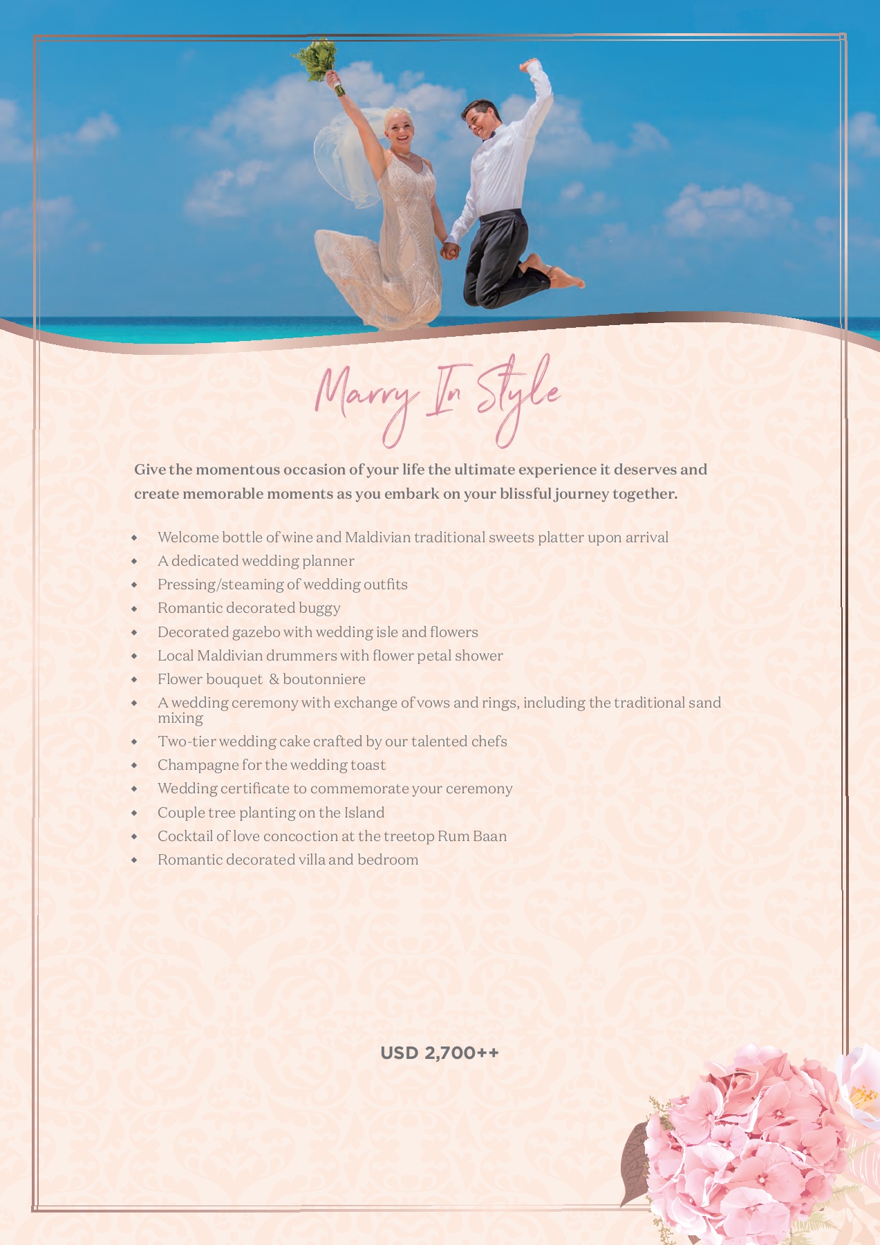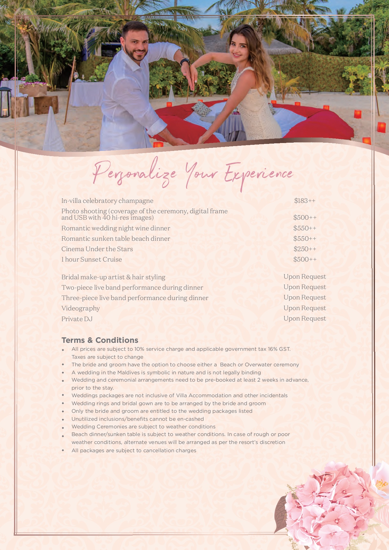 • частный ужин из 3 блюд на пляже и floating breakfast, один раз в течение всего пребывания (из меню ресторана Aailaa);