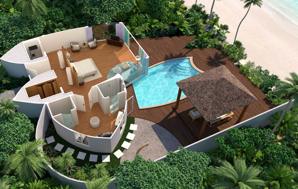 Пляжная вилла на стороне домашнего рифа, двуспальная кровать king-size, гостиная зона с креслами и кушеткой, гардеробная, ванная комната с ванной и душем, терраса, персональный бассейн, душ под открытым небом, прямой выход на пляж, вид на океан и восход, см.фото, фото-схема номера;