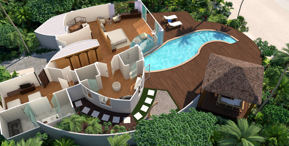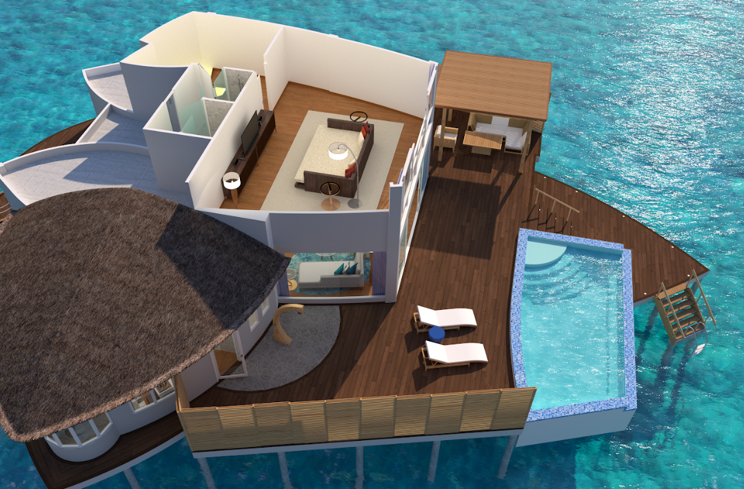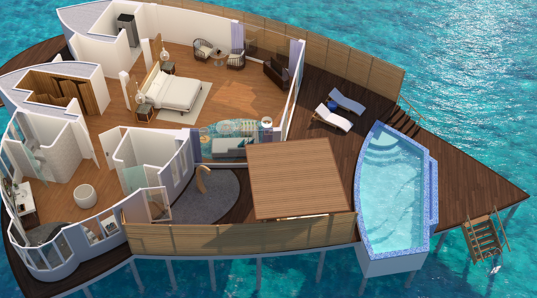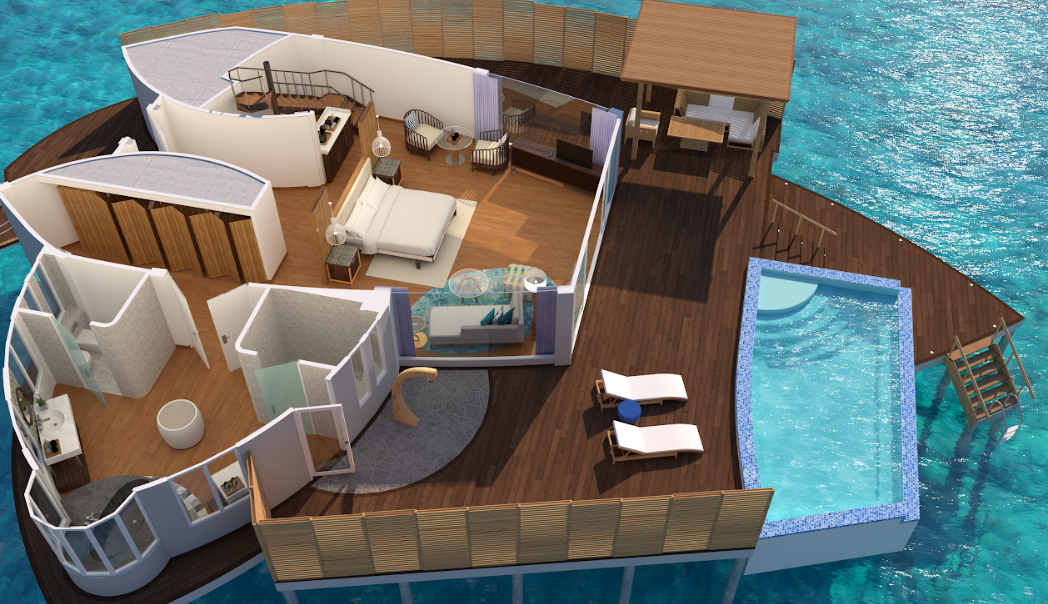 • 12 номеров Duplex Over Water Pool Villa (274 м², макс. 3 или 2+2).