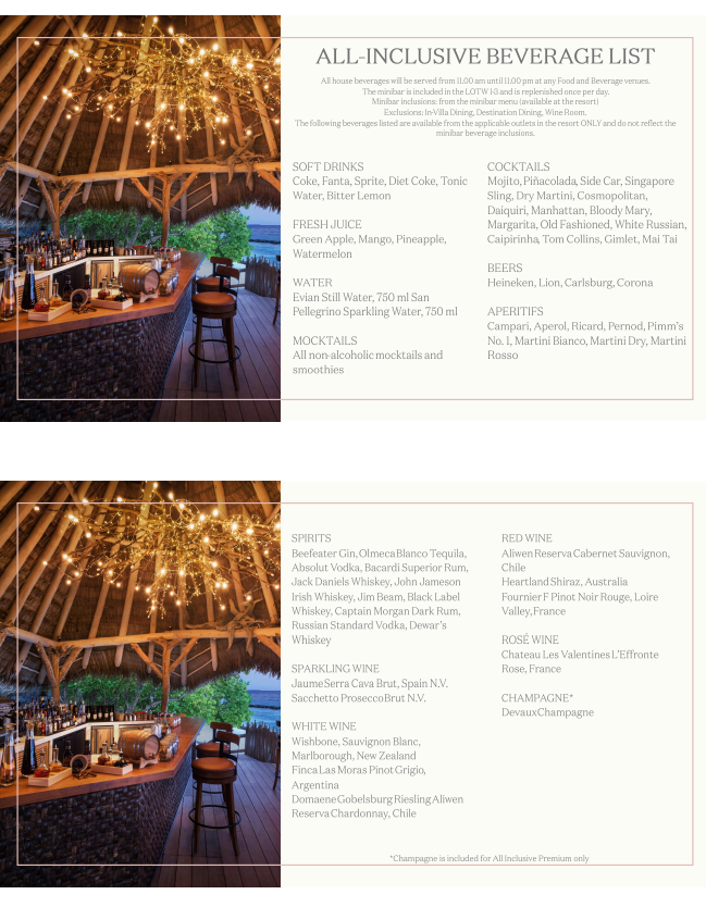 • план питания основан на меню из трех блюд на человека, состоящем из закуски, основного блюда, десерта и неограниченного количества напитков, таких как безалкогольные напитки, вода, пиво, безалкогольные коктейли и вина только из выбранного списка напитков;