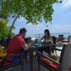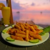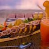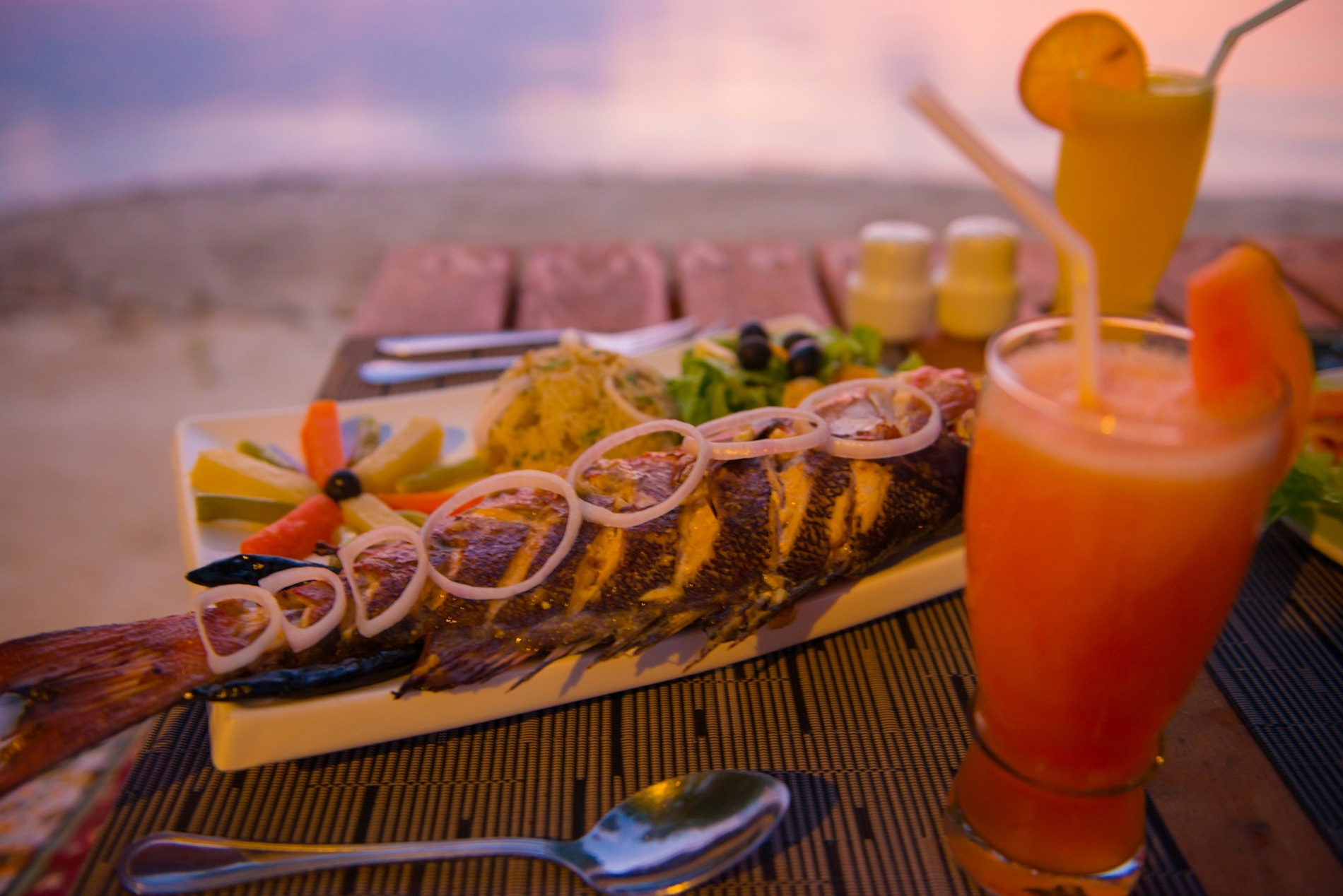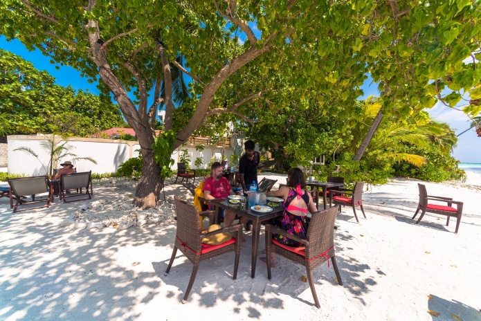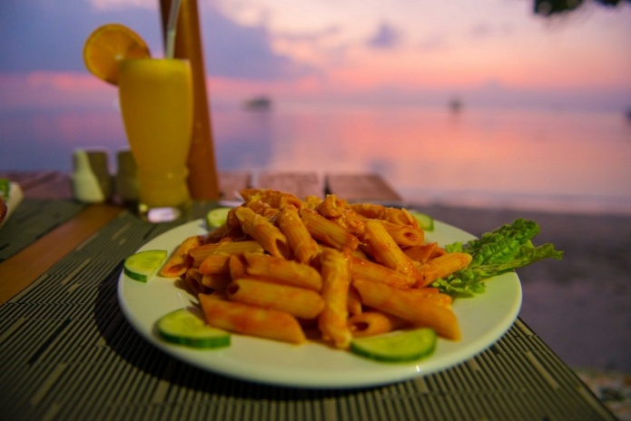 Столики расположены прямо на пляже: к услугам гостей большой выбор блюд и напитков, в том числе вегетарианских. Возможна организация приватных ужинов и барбекю на пляже.