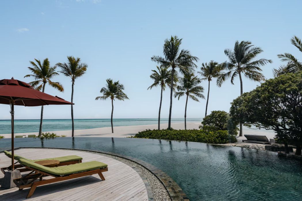 Пляжный сьют, двуспальная кровать king-size, гостиная зона с диваном-софа и креслом, ванная комната с ванной и душем, душ под открытым небом, меблированная терраса с качелями,частный бассейн (3,5х3), прямой выход на пляж, план номера.