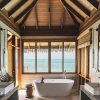 Водная вилла, двуспальная кровать king-size или 2 односпальные кровати, гостиная зона с диваном-софа, ванная комната с ванной и душем, меблированная терраса, прямой спуск в лагуну, вид на океан и восход, план номера;