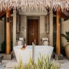 Пляжная вилла, двуспальная кровать king-size или 2 односпальные кровати, гостиная зона с диваном-софа, ванная комната с ванной и душем, душ под открытым небом, терраса с качелями, прямой выход на пляж, вид на закат, план номера;