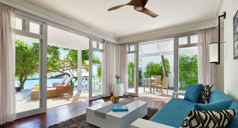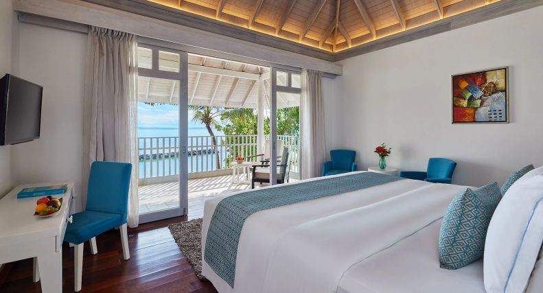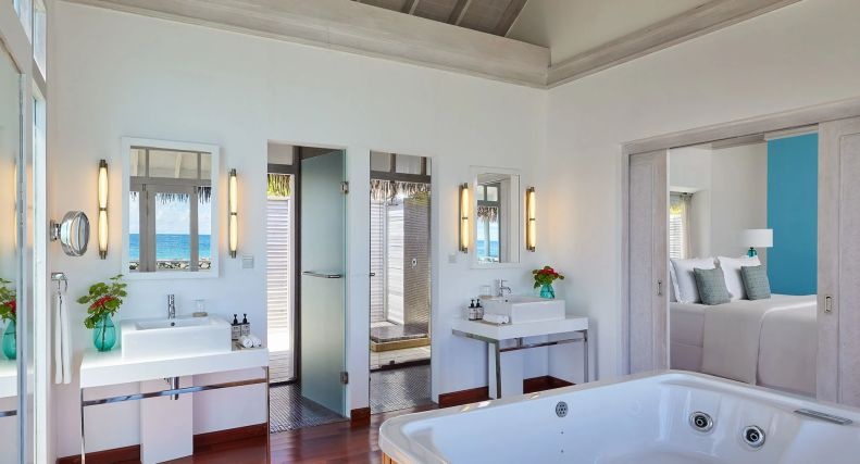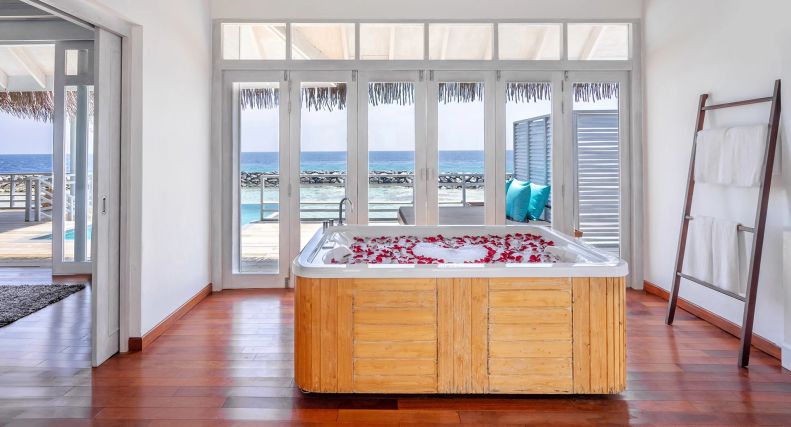 Надводная вилла, спальня с двуспальной кроватью king-size, отдельная гостиная комната с диваном-софа, ванная комната с гидромассажной ванной и душем, гостевой туалет, летний душ, терраса, частный бассейн, вид на океан.