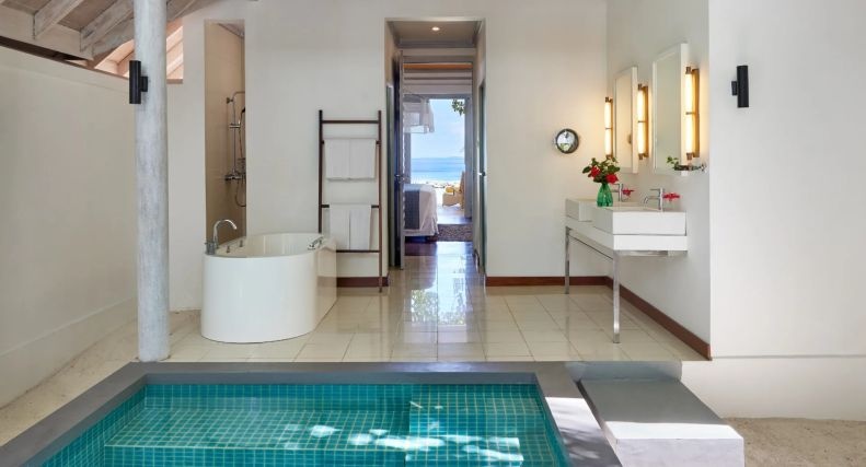 Пляжные виллы, двуспальная кровать king-size, ванная комната с гидромассажной ванной, душ под открытым небом, терраса, частный бассейн, вид на океан, прямой выход на пляж;