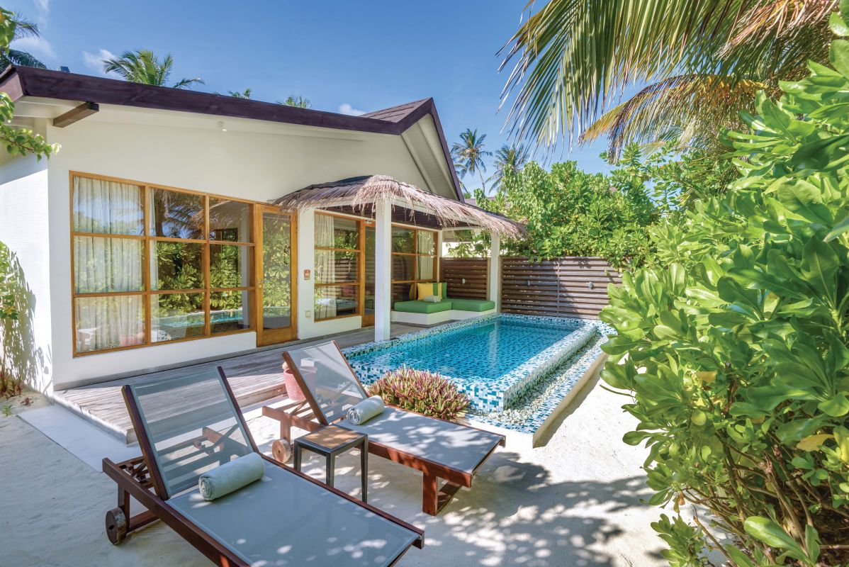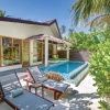 Расположены на пляже, двуспальная кровать king-size, терраса, открытый персональный бассейн (13 м²), ванная комната астично на открытом воздухе (ванна и душ), прямой выход к пляжу, вид на лагуну, см.план номера. Виллы с бассейном расположены на северной стороне острова, где рядом с главным рестораном есть небольшой участок рифа (подходит для новичков);
