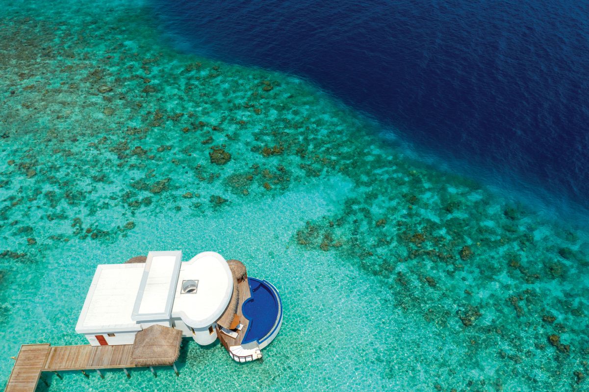 Расположены на сваях над водой, двуспальная кровать king-size, терраса, открытый персональный бассейн (8 м²), прямой спуск в воду, вид на океан, см. план номера. Виллы с бассейном развернуты на закат, вид на основной остров Sangeli и One Banyan, небольшой участок рифа;