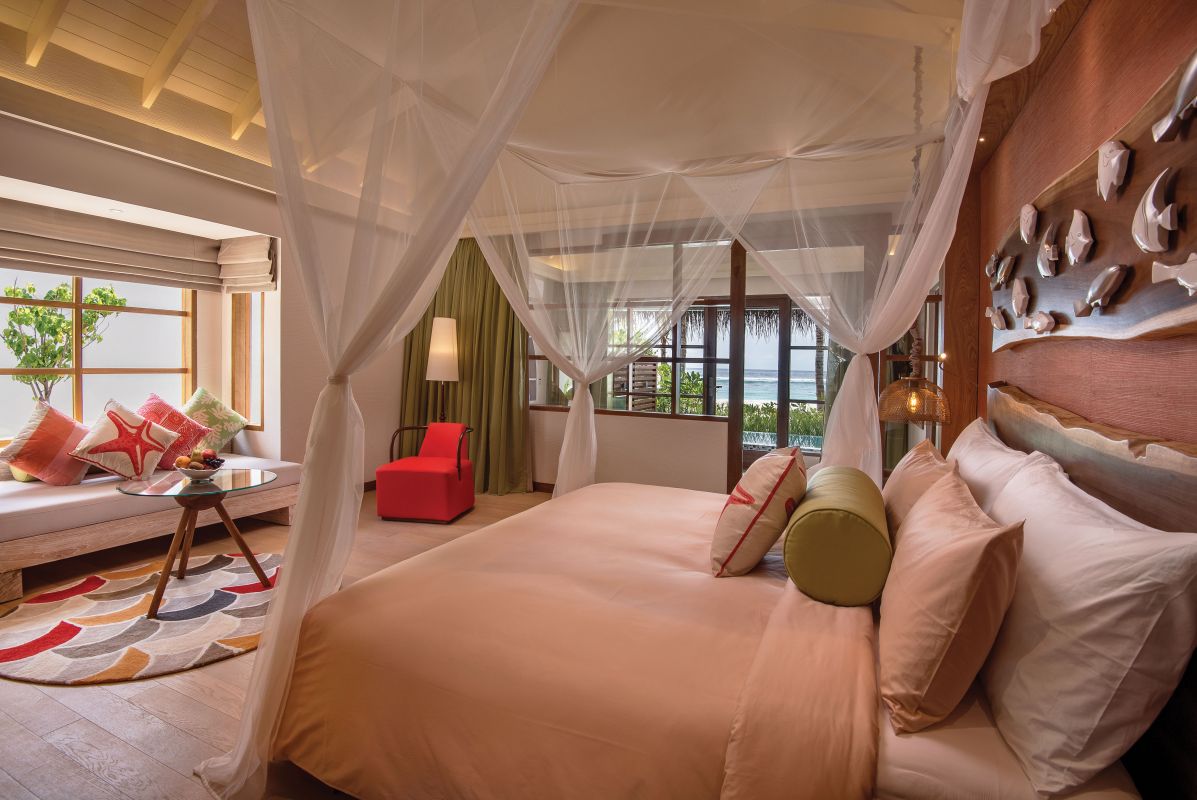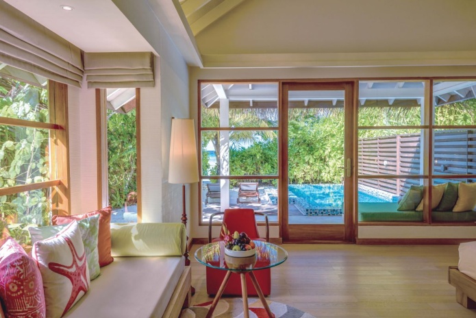 Пляжные виллы, 2 спальни: просторная главная спальня и уютная комната с двумя односпальными кроватями, каждая с собственной ванной комнатой, небольшая гостиная, терраса, открытый персональный бассейн (13 м²), прямой выход к пляжу, дополнительные места: кушетка в главной спальне, доп. кровать во второй спальне), см.план номера. Особенности: виллы с бассейном расположены на северной стороне острова, где есть небольшой участок рифа, в главной спальне - просторная ванная комната с тропическим душем, ванной под открытым небом и мини-садом, во второй спальне – ванная комната с душем, межкомнатная дверь, также есть выход из каждой спальни на террасу, детский клуб, главный ресторан и бар с бассейном в шаговой доступности, для посещения острова One Banyan гости могут воспользоваться багги сервисом, 2 лежака у виллы и 2 лежака с зонтиком на пляже.