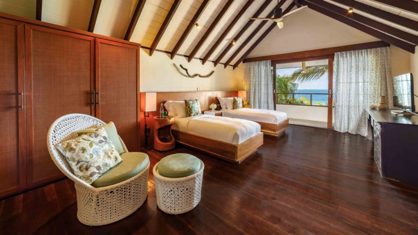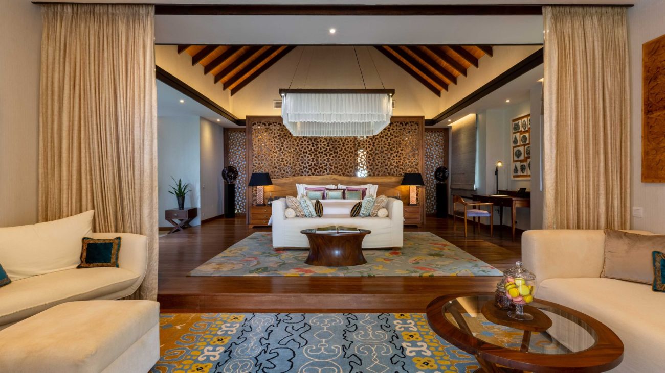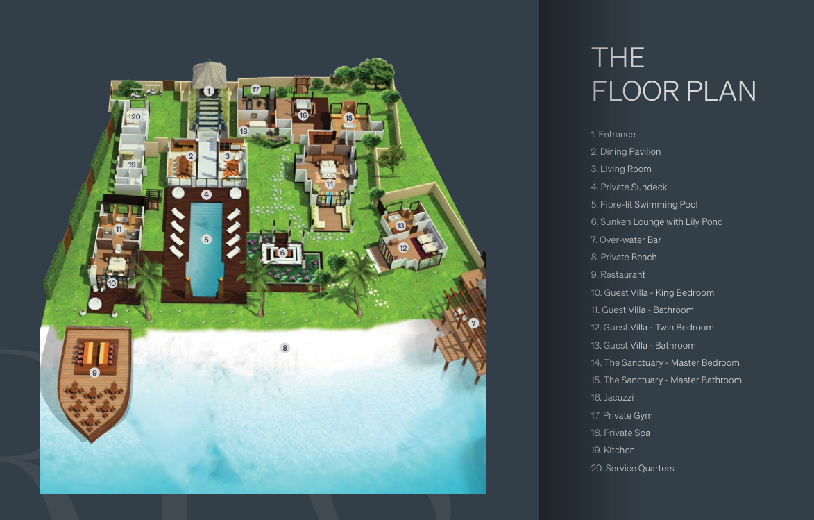 Пляжная резиденция, 3 спальни: 2 двуспальные кровати king-size и 2 односпальные кровати, в основной ванной комнате есть джакузи на 6 человек и глубокая ванна Kelly Hoppen™, гостевая ванная комната, гостиная комната, тренажерный зал, спа-павильон, терраса для отдыха на свежем воздухе, кухня и винный погреб, 2 персональных бассейна, частный пляж, общая площадь - 3000 м², вид на океан, комната для персонала, обслуживание на вилле, услуги дворецкого (круглосуточно), обслуживающий персонал: шеф-повар, официант и спа-терапевт, ежедневные услуги прачечной, три часа спа-процедур каждый день, см.план номера.