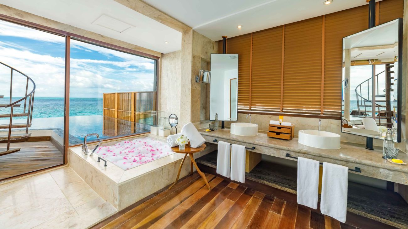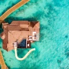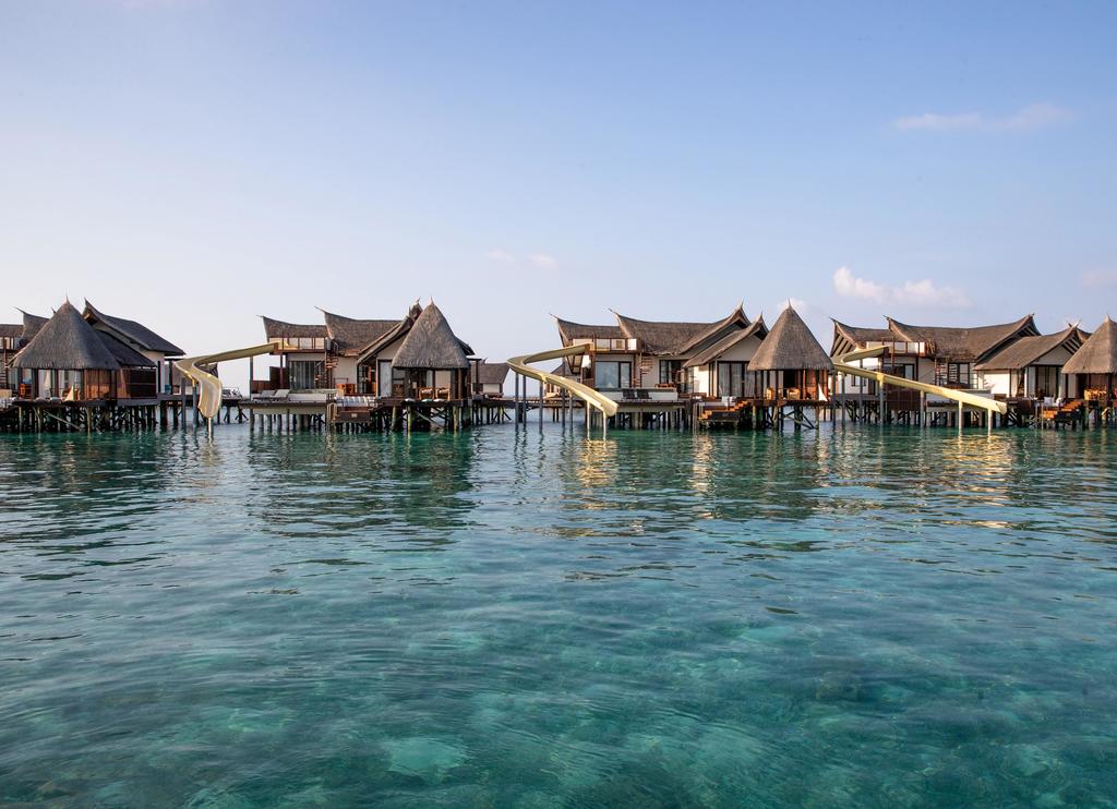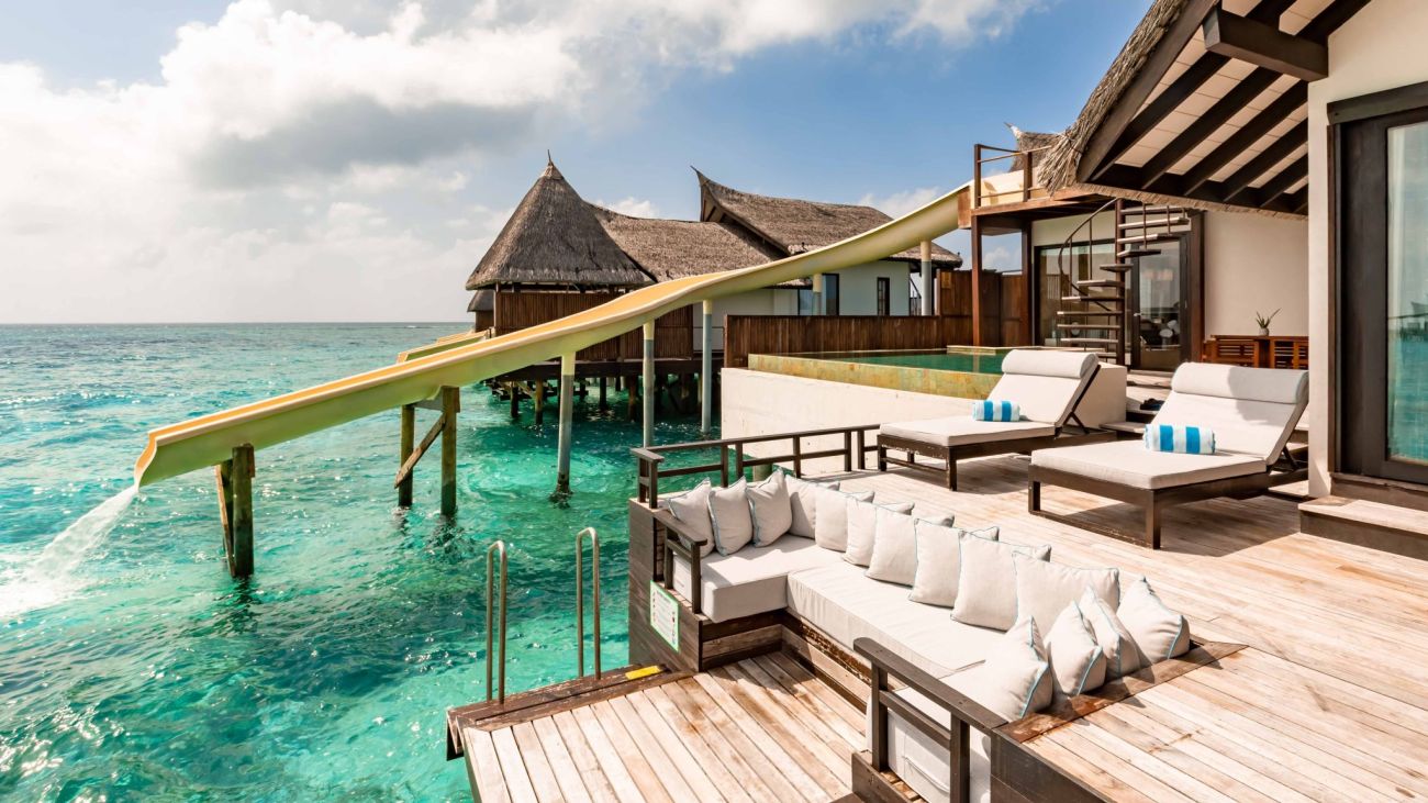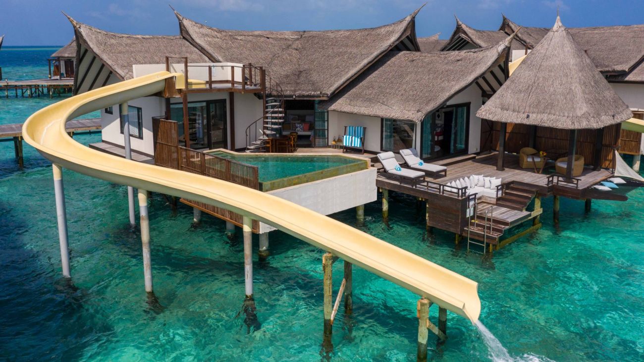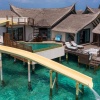Двухэтажные виллы на воде, 2 спальни: двуспальная кровать king-size и круглая кровать queen-size, гостиная комната, 2 ванные комнаты, гардеробная, персональный бассейн (35 м²) с лежаками, 23-метровая водная горка, открытая терраса с зоной отдыха, гамак над водой, общая территория 420 м², вид на океан и закат, прямой спуск в воду;