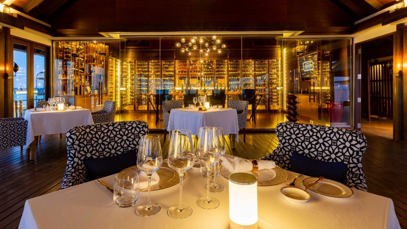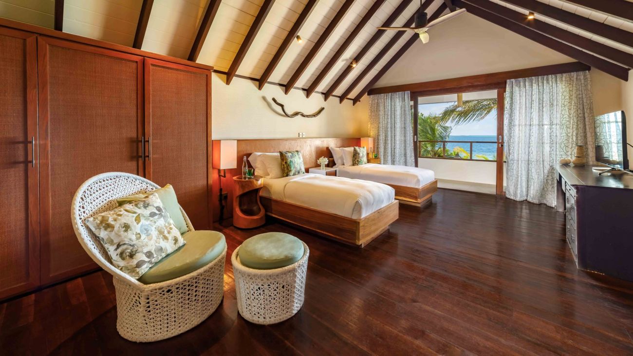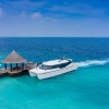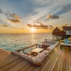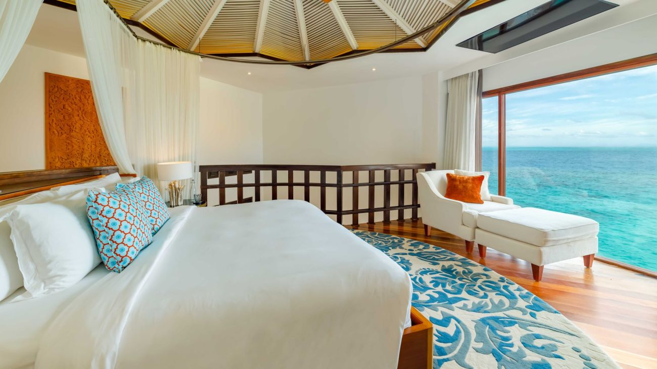 Двухэтажные виллы на воде, 2 спальни: двуспальная кровать king-size и круглая кровать queen-size, гостиная комната, 2 ванные комнаты, гардеробная, персональный бассейн (35 м²) с лежаками, 23-метровая водная горка, открытая терраса с зоной отдыха, гамак над водой, общая территория 420 м², вид на океан и закат, прямой спуск в воду;