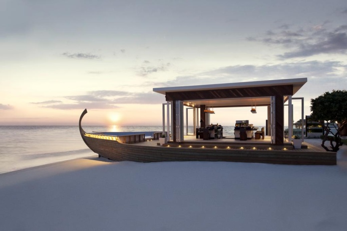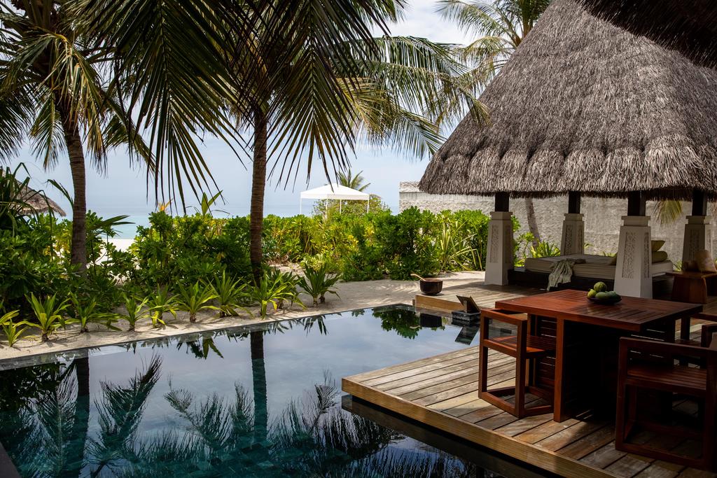 Пляжный павильон, 2 спальни: двуспальная кровать и 2 односпальные, ванная комната с 2 раковинами, душем, ванна под открытым небом, гардеробная, терраса, беседка, персональный бассейн L-образной формы, общая территория 424 м², прямой выход на пляж, вид на океан;