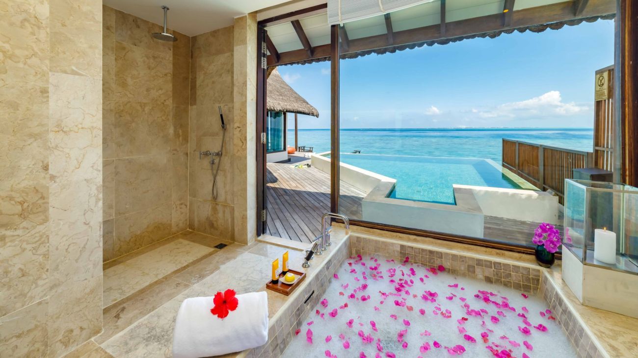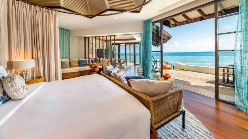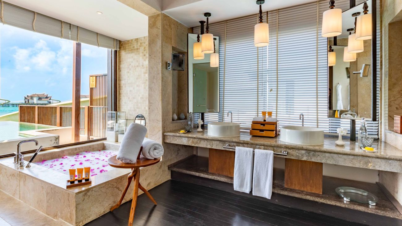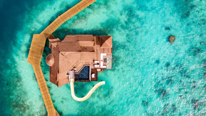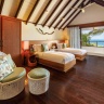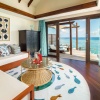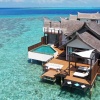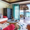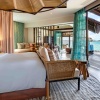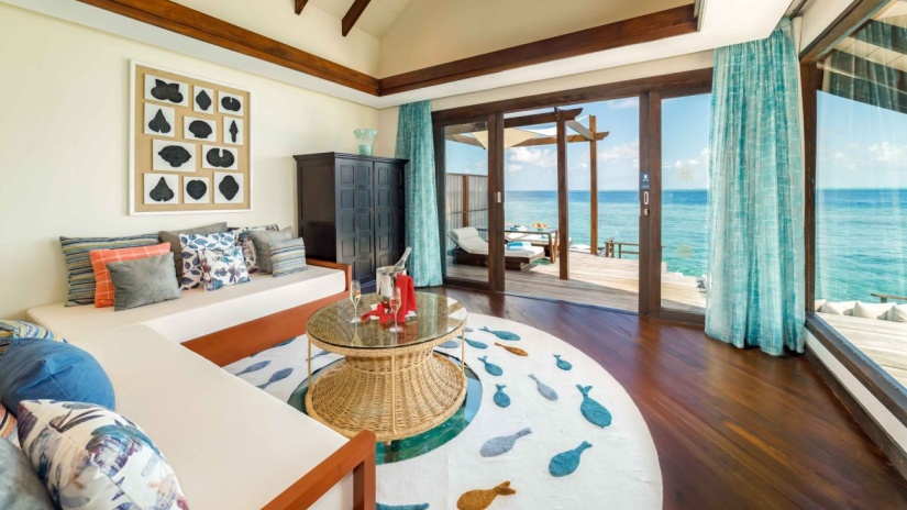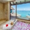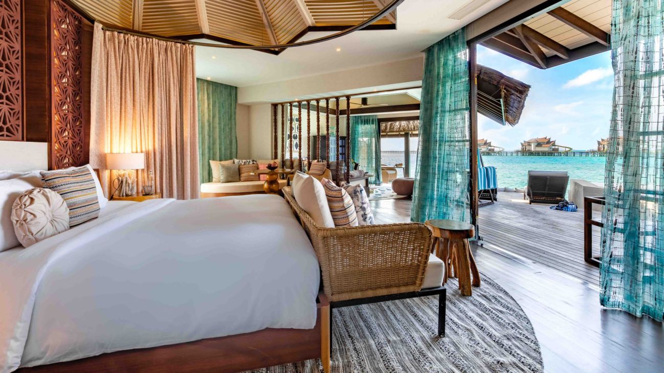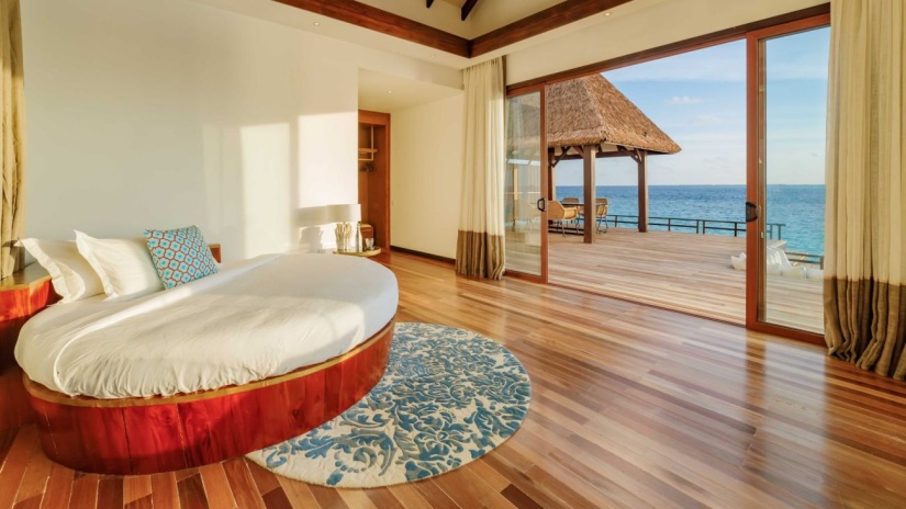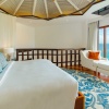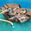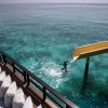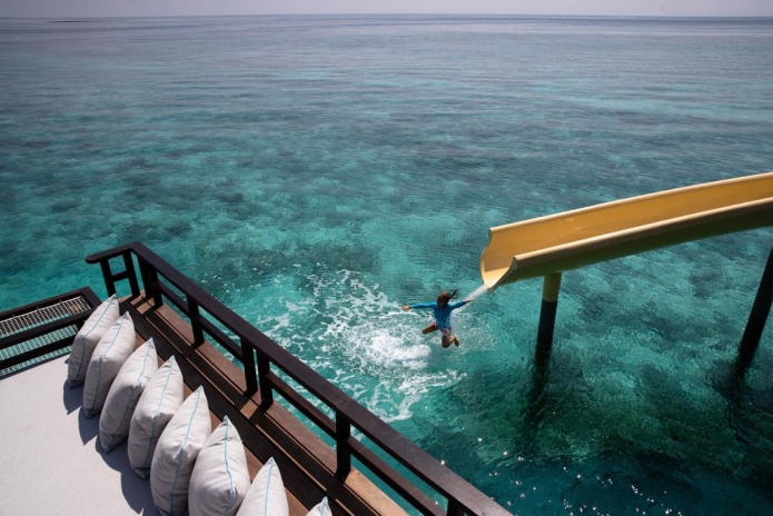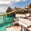 Виллы на сваях над водой, двуспальная кровать king-size, гостиная зона с диваном и креслом, ванная комната с 2 раковинами, душем и ванной, меблированная терраса с персональным бассейном, гамак над водой, водная горка с приподнятого балкона в лагуну (горка протяжённостью 23 м), прямой спуск в воду, общая территория 248 м², вид на океан;