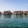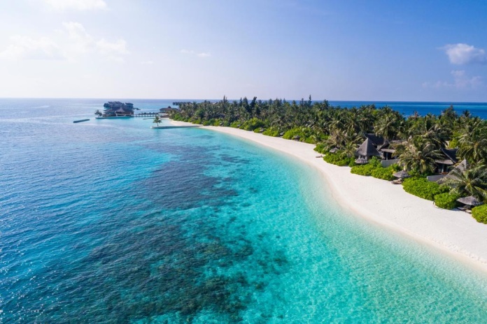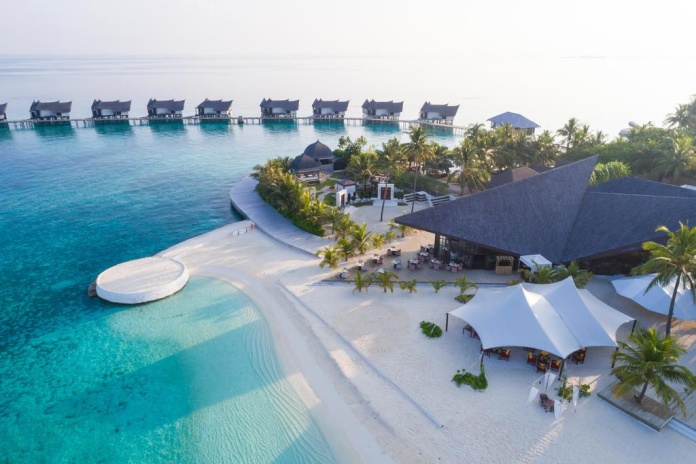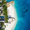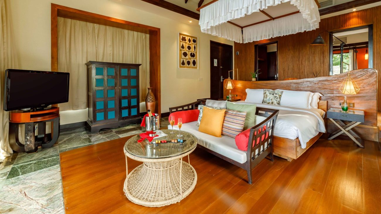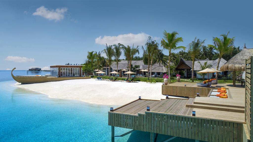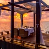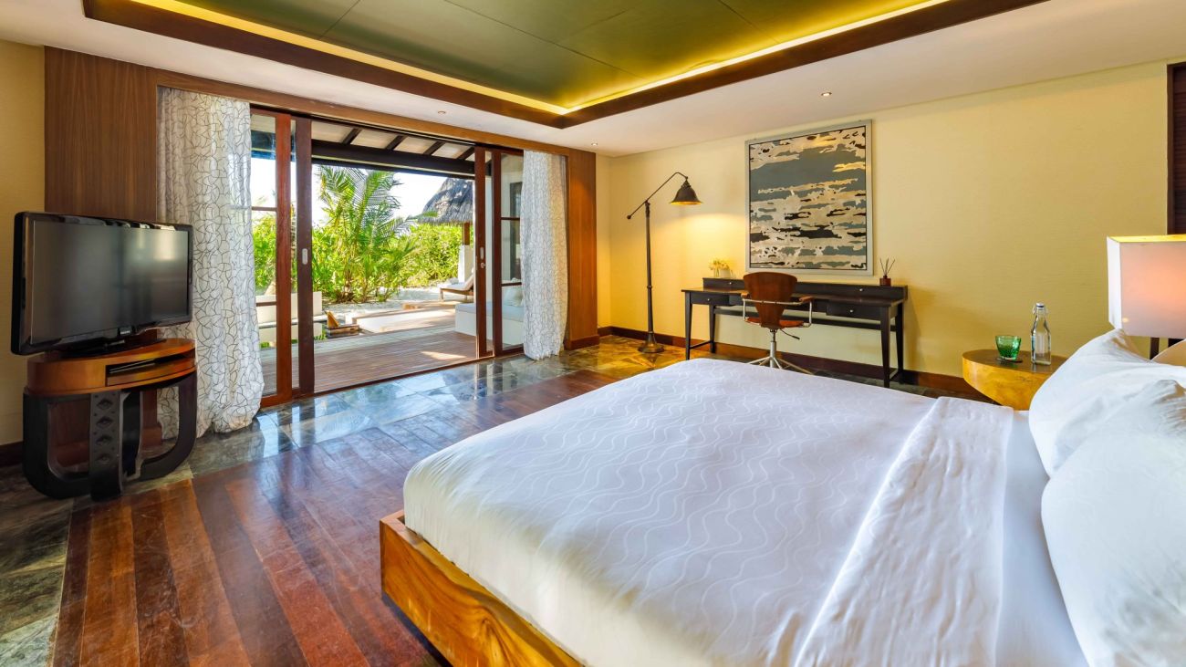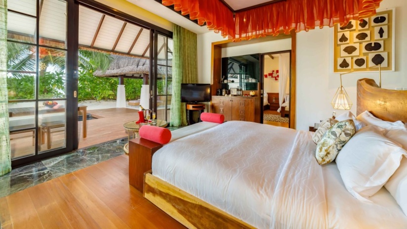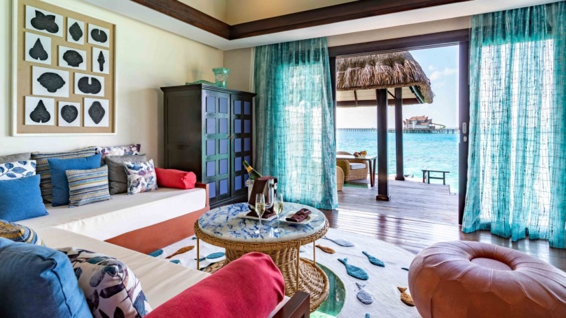 Виллы на сваях над водой, двуспальная кровать king-size, гостиная зона с диваном и креслом, ванная комната с 2 раковинами, душем и ванной, меблированная терраса с персональным бассейном, гамак над водой, водная горка с приподнятого балкона в лагуну (горка протяжённостью 23 м), прямой спуск в воду, общая территория 248 м², вид на океан;