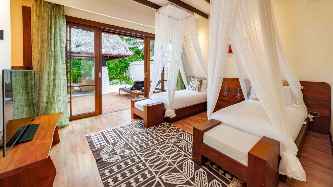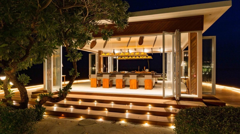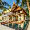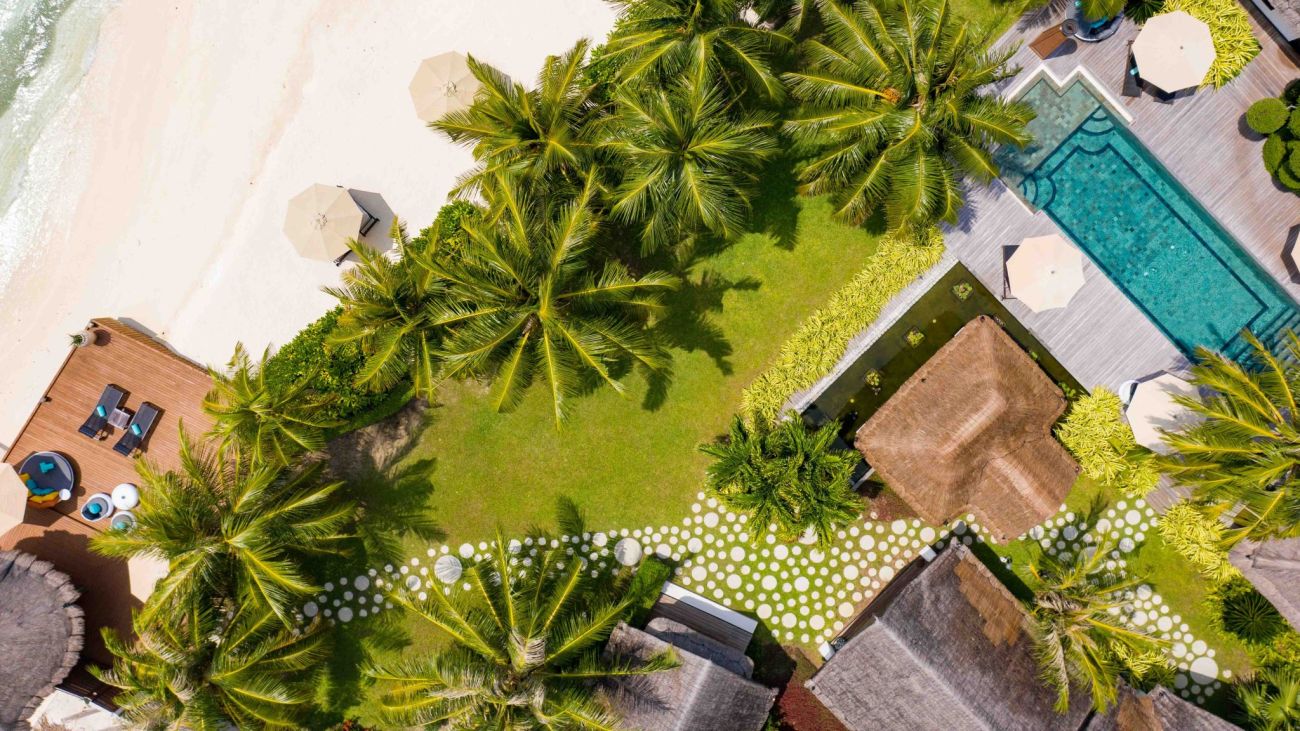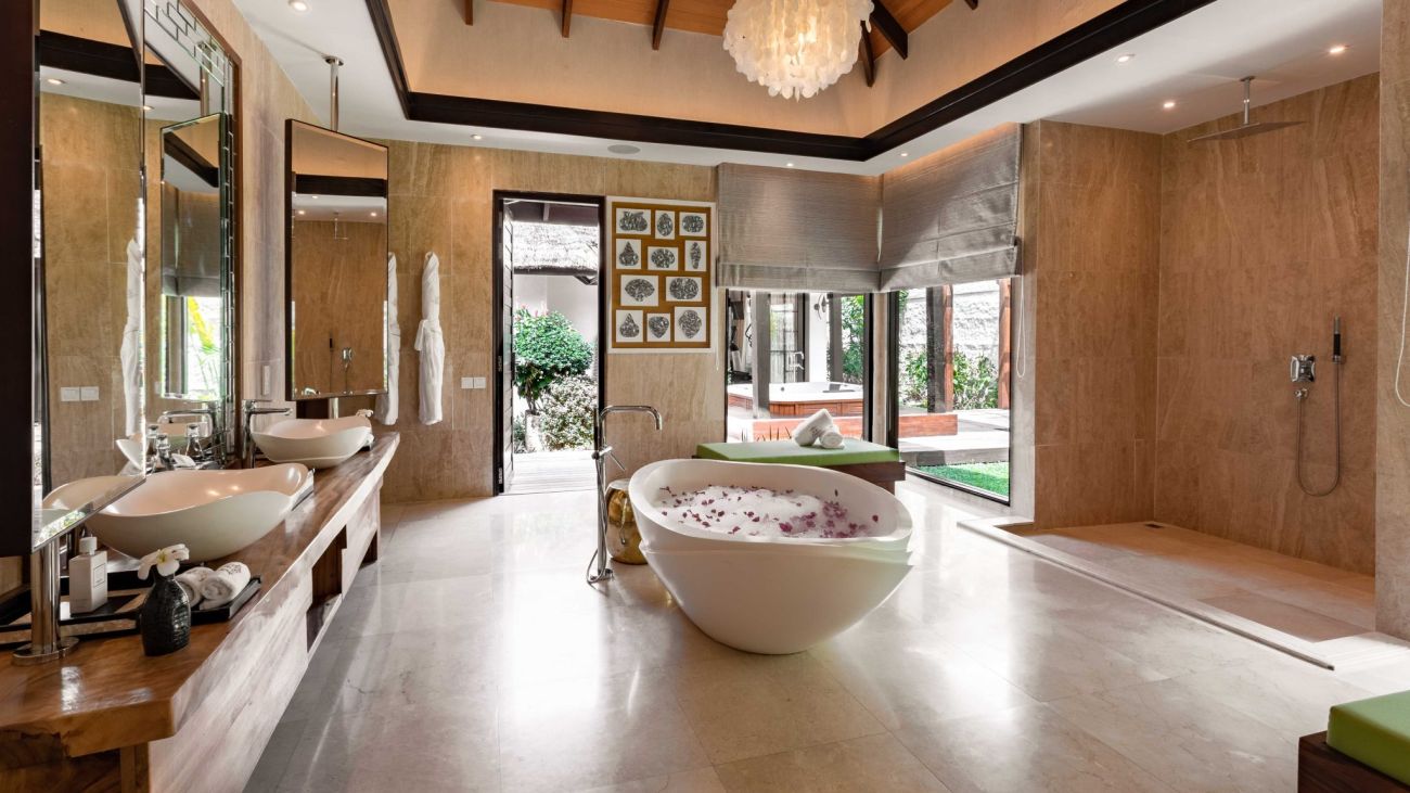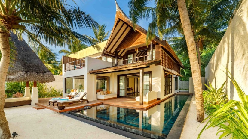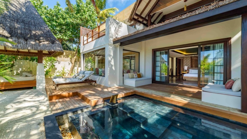 Двухэтажные пляжные виллы, 2 спальни: двуспальная кровать king-size и 2 односпальные кровати, отдельная гостиная комната, 2 ванные комнаты (одна с ванной и душем под открытым небом, вторая с душем), гардеробная, комната с бильярдным столом, частный бассейн L-образной формы c лежаками, открытая терраса с зоной отдыха и обеденной зоной, балкон, прямой выход к пляжу, общая территория 594 м², вид на закат;