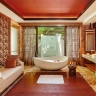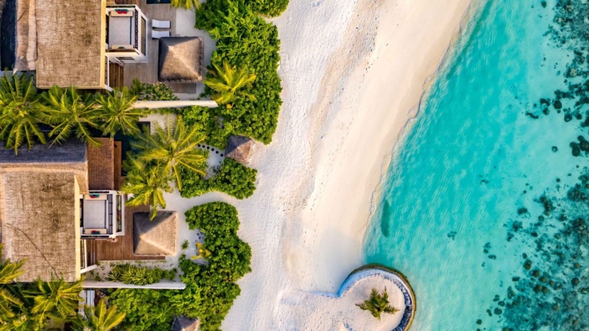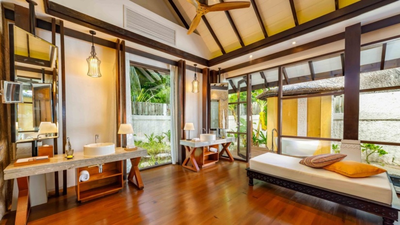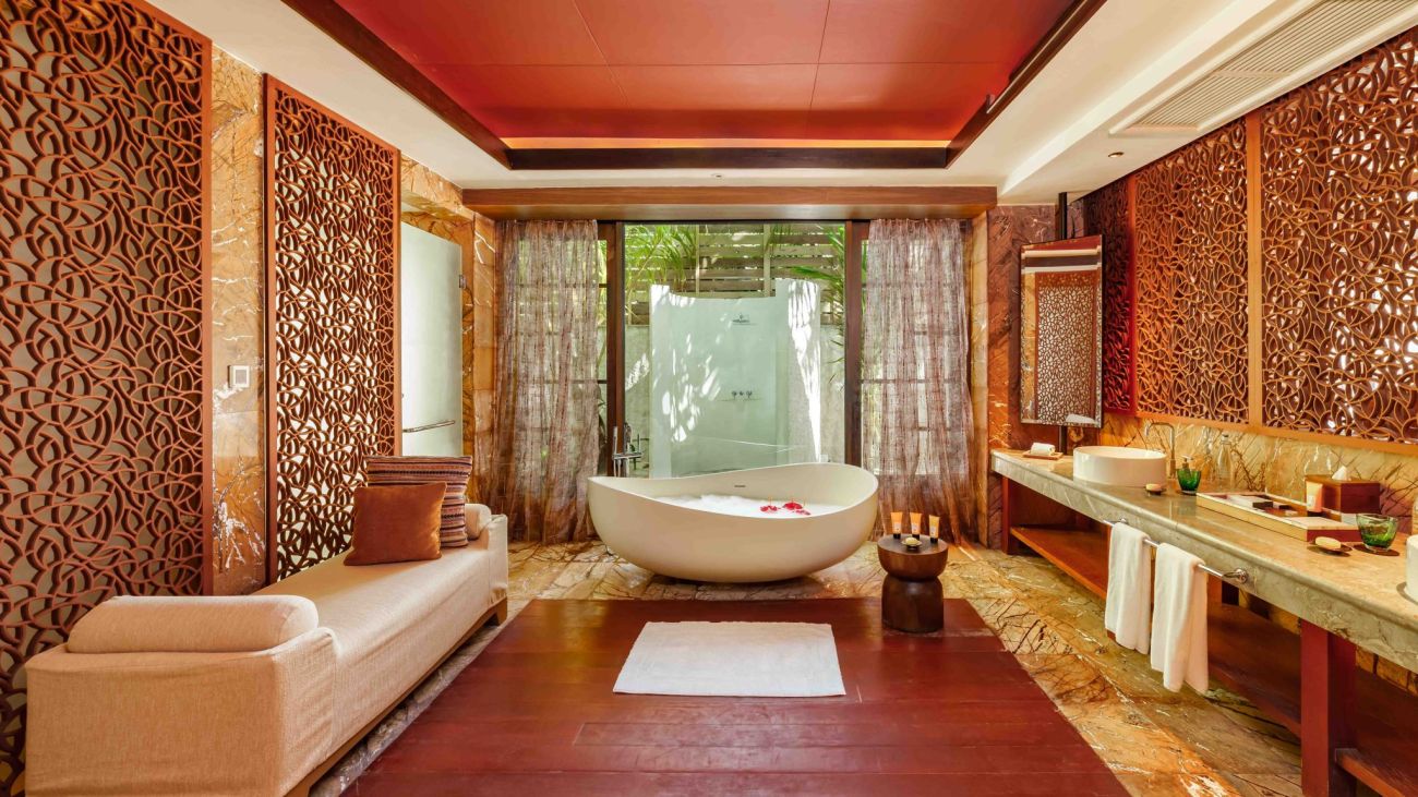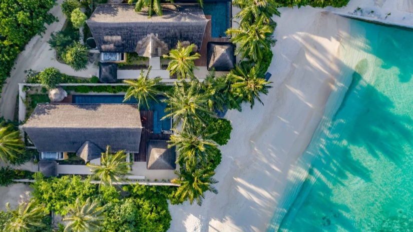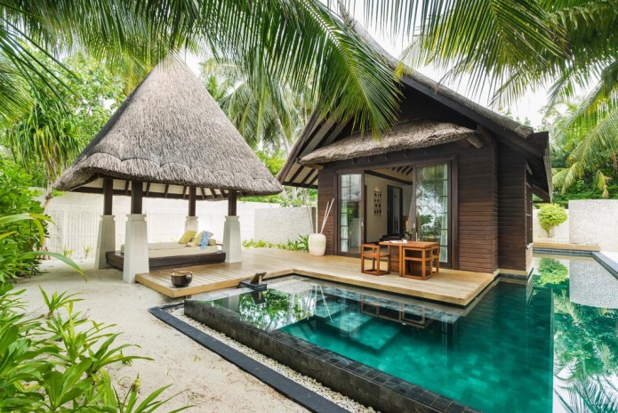 Пляжные виллы, двуспальная кровать king-size, гостиная зона, гардеробная, ванная комната с 2 раковинами, душем, ванна под открытым небом, терраса, беседка, персональный бассейн L-образной формы, прямой выход на пляж, общая территория 418 м², вид на восток/запад;