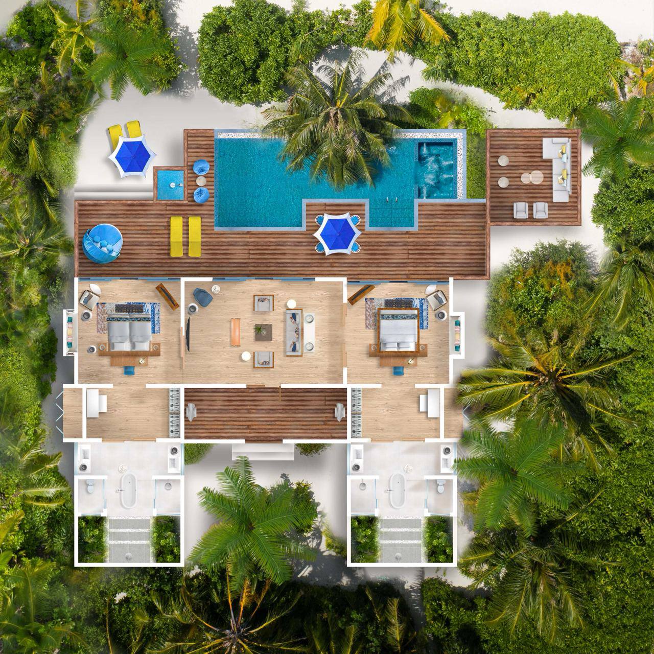 - 2 номера Family Pool Villa (300 м², макс. 2+2).