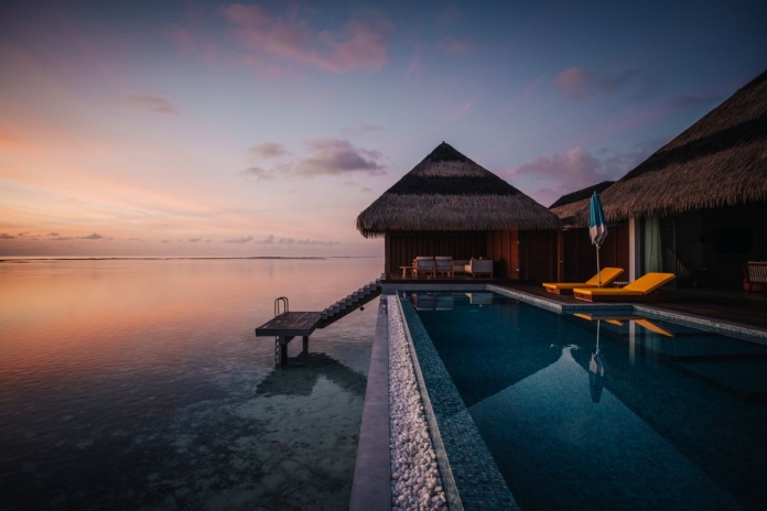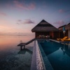 Водная вилла, двуспальная кровать king-size, диван-кушетка в нише, ванная комната с ванной и душем, летний тропический душ, терраса для отдыха на свежем воздухе, персональный бассейн, размер бассейна: 6,1 x 3 м, глубина: 1, 2 м, прямой спуск в воду, вид на закат;