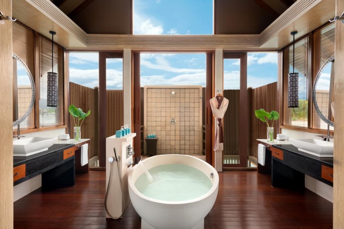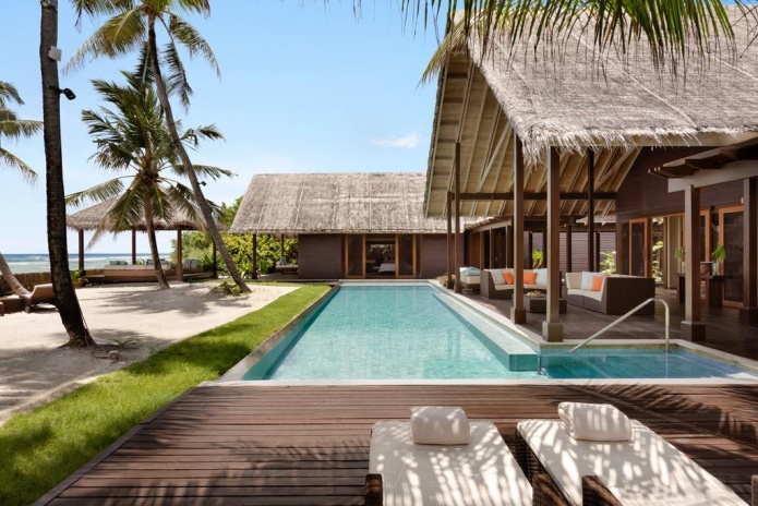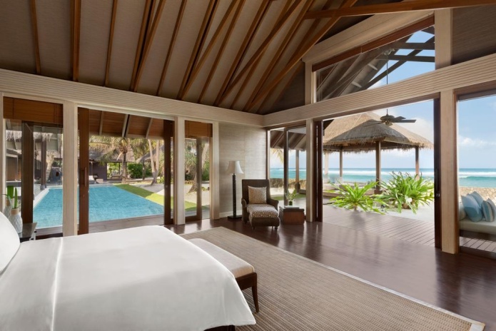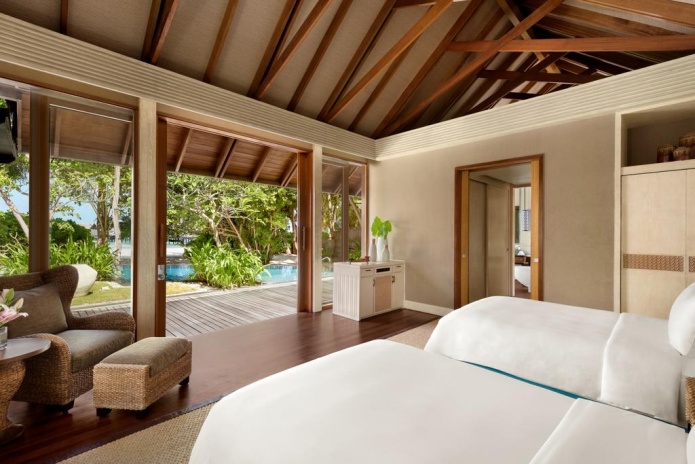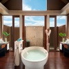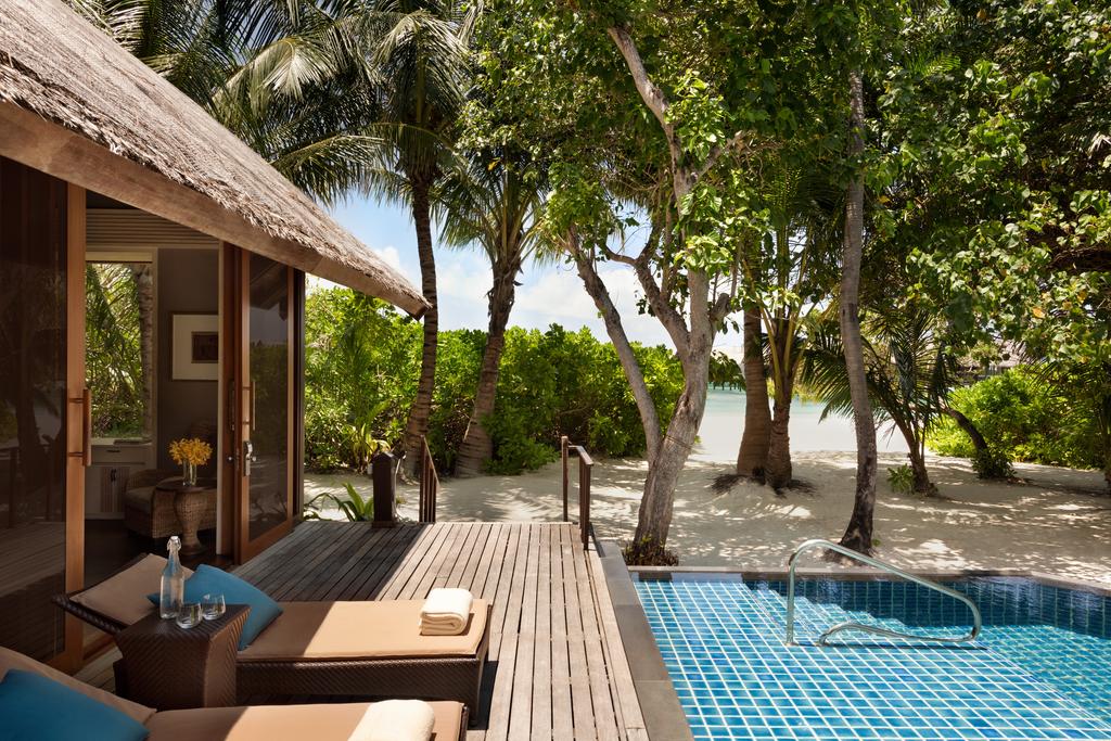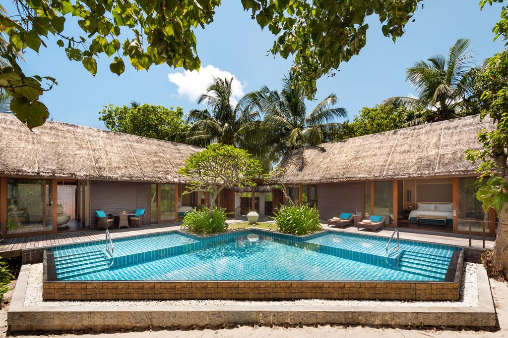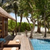 • Beach Villa with Private Pool (189 м2, вилла 93 м2 с видом на лагуну и прямым выходом к пляжу, с бассейном 12 м2 на широкой террасе; 2 павильона для гостиной и спальни; ванная комната с ванной овальной формы, 2 душа: в помещении и на открытом воздухе, макс. 3 или 2+2 чел.)