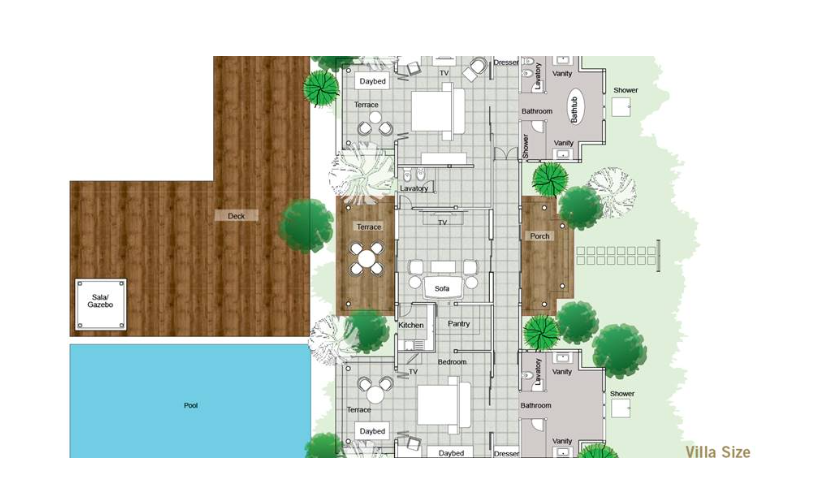 Важно: по прибытии гости отеля должны внести депозит для гарантии оплаты доп.услуг. Размер депозита зависит от плана питания (вилла/ночь):