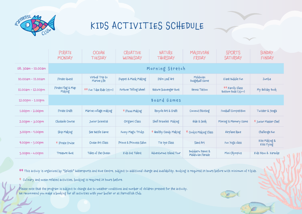 • клуб для подростков и всей семьи Coconut (круглосуточно): еженедельные программы, такие как уроки живописи, настольный футбол, изготовление ожерелий, татуировки хной и многое другое;