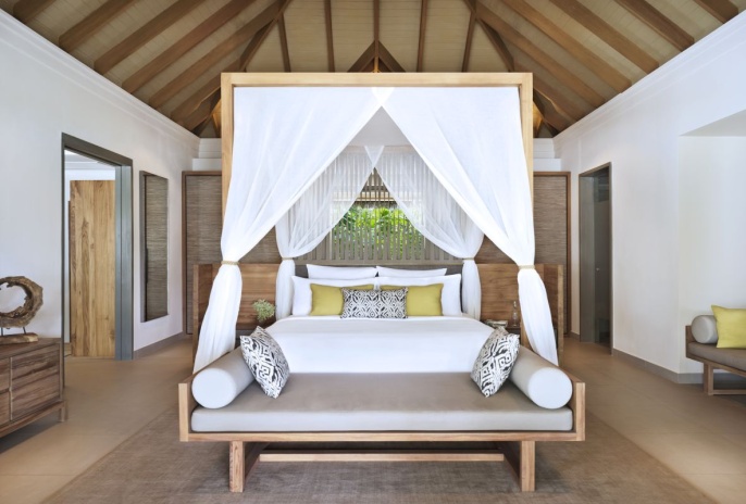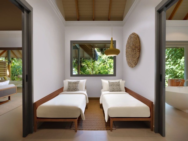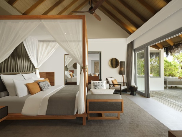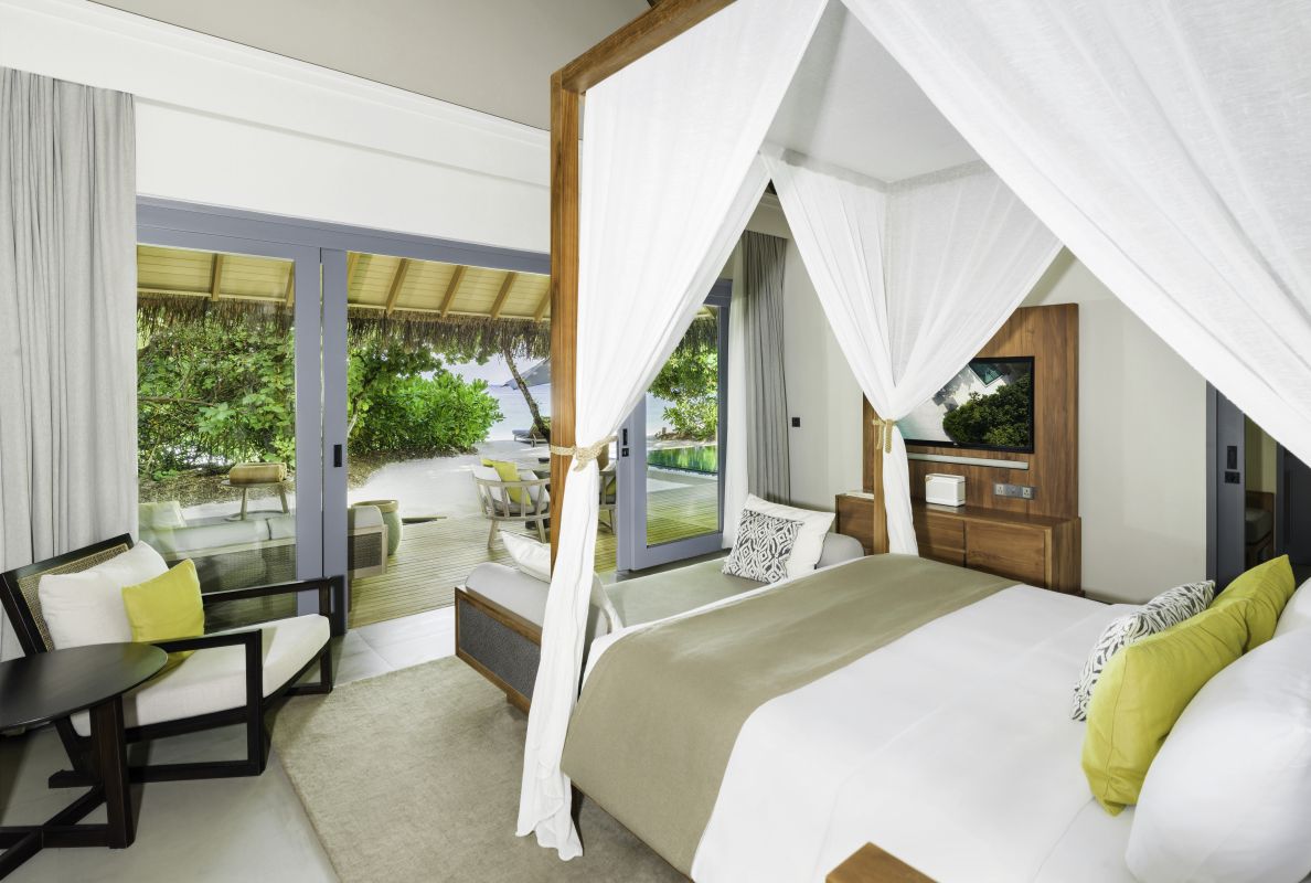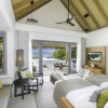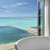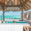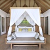 Двухэтажная вилла на сваях над водой, 4 спальни: 2 двуспальные кровати king-size и 4 односпальные кровати, 4 ванные комнаты, гостиная комната с обеденной зоной и мини-кухней, гостевой туалет, 2 гардеробные, меблированная терраса, балкон, открытый персональный бассейн (55 м²), джакузи на открытом воздухе, 2 комнаты для персонала (каждая – с ванной комнатой с душем), 3 душа под открытым небом, прямой спуск в воду, вид на океан и закат, особые привилегии, см. фото и план номера;