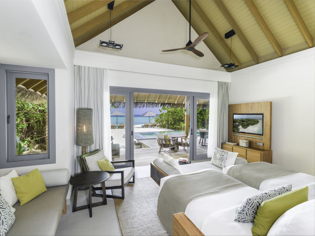 Расположены на пляже, 2 спальни: двуспальная кровать king-size, 2 односпальные кровати, 2 дивана-кушетки, отдельная гостиная комната с диваном и обеденным столом, меблированная терраса, открытый персональный бассейн (38 м²), 2 ванные комнаты с ванной, 3 душа на открытом воздухе, см. фото и план номера;