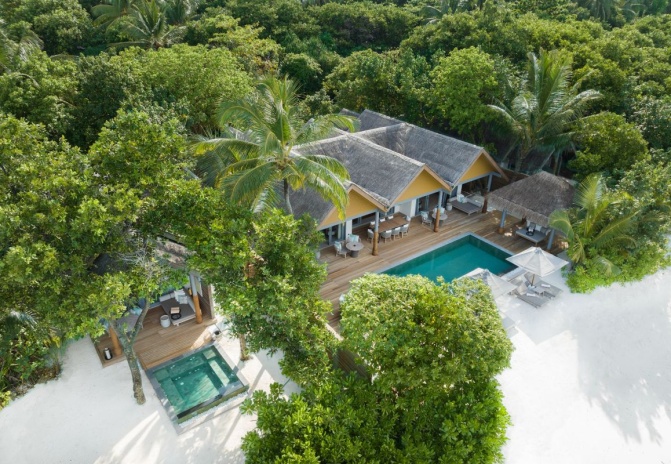 Пляжная вилла, 4 спальни с 4 двуспальными кроватями king-size, 4 дивана-кушетки, 4 ванные комнаты, 4 душа под открытым небом, 3 террасы, персональный открытый бассейн (68 м², включая 2 небольших бассейна), 2 джакузи под открытым небом, прямой выход на пляж, см. фото и план номера.
