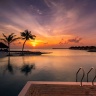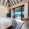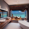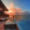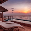 Водная вилла расположена в конце деревянного причала, панорамный вид на закат, персональный бассейн (15 м²), спальня с двуспальной кроватью king-size, гостиная комната, ванная комната с ванной и душем, меблированная терраса с лежаками, прямой спуск в воду, план номера;