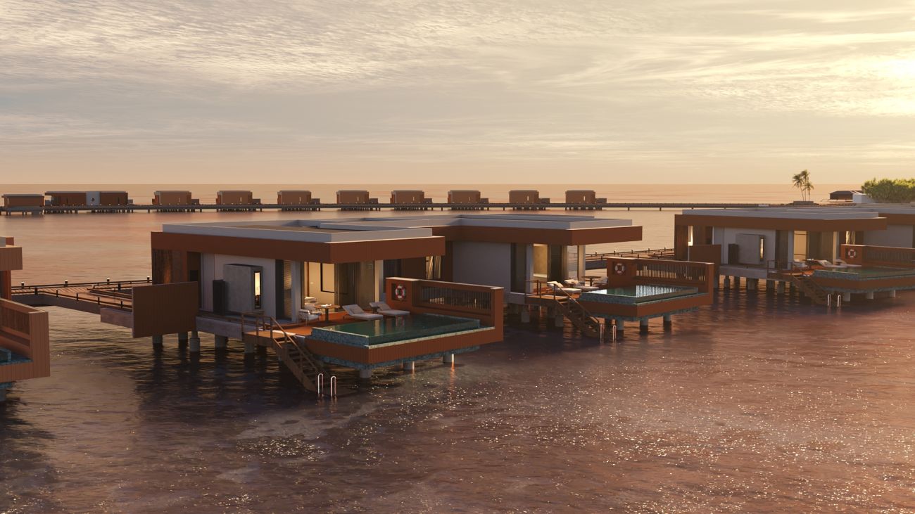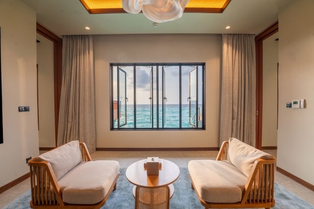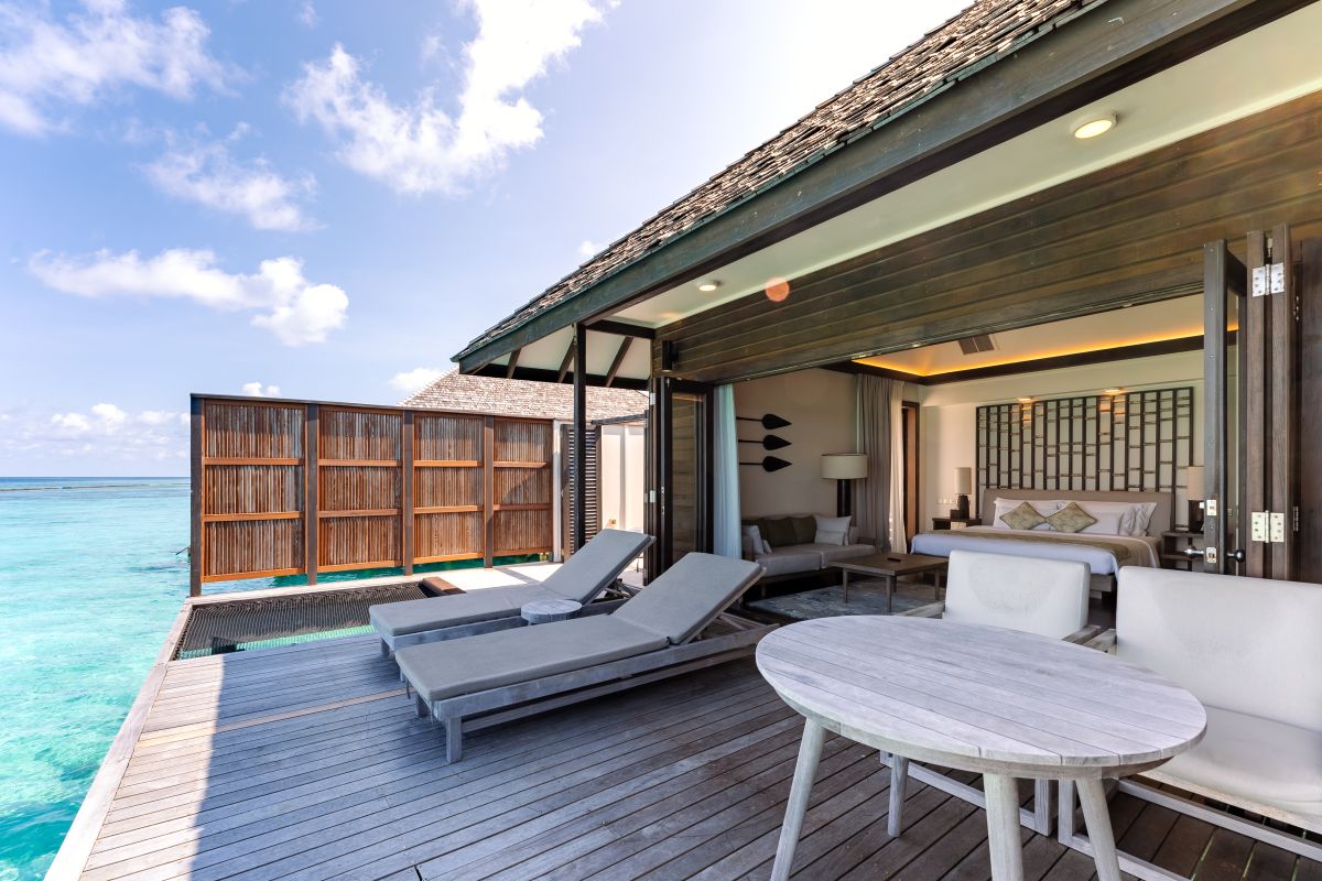 Расположены в тихом северо-восточном уголке острова, водные виллы, 2 спальни с двуспальными кроватями king-size, 2 ванные комнаты с ванной и душем, отдельная гостиная комната, объединяющая две главные спальни, 2 террасы с лежаками, 2 открытых небольших бассейна infinity (размер каждого бассейна - 5,8 м х 3 м),  прямой спуск в воду, вид на рассвет, стеклянные панели на полу у входа, см.план номера;