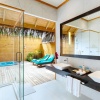 Водные виллы на сваях над лагуной на восточной стороне острова рядом с оживленным домашним рифом, двуспальная кровать king-size, частично открытая ванная комната с душем и джакузи под открытым небом, ванная комната с душем, меблированная терраса, прямой спуск в воду, вид на восход, см.план номера;
