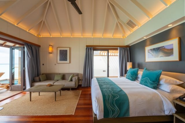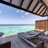 На тихой северной оконечности острова с прямым доступом к рифу, водные виллы, 2 спальни с двуспальными кроватями king-size, 2 ванные комнаты с ванной и душем, отдельная гостиная комната, объединяющая две главные спальни, 2 террасы с лежаками, 2 открытых небольших бассейна infinity (размер каждого бассейна - 6,5 м х 3 м), прямой спуск в воду, вид на закат, стеклянные панели на полу у входа, см.план номера.