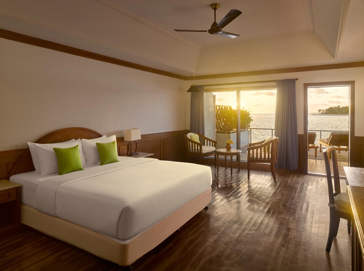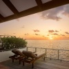 Водная вилла на сваях над водой расположены по 2 номера в одной вилле, двуспальная кровать, гостиная зона с креслами, ванная комната с ванной, меблированная терраса, прямой спуск в воду, вид на закат, план номера;
