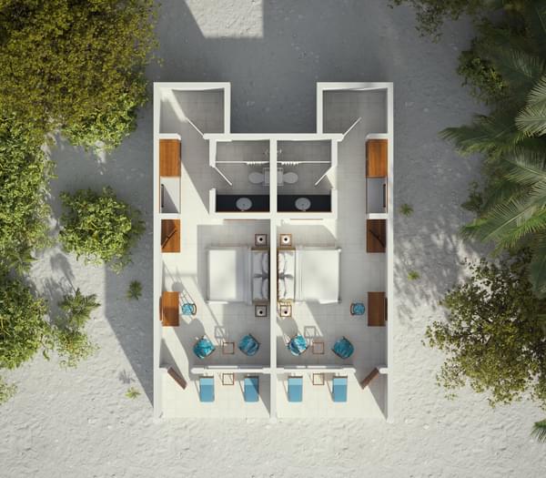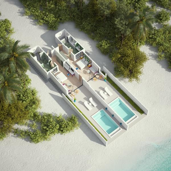 Две отдельно стоящие виллы соединены между собой, 2 спальни с двуспальными кроватями и гостиной зоной с диванами, 2 ванные комнаты с ванной, душ под открытым небом, 2 террасы, 2 частных бассейна, план номера, новая категория август 2023;