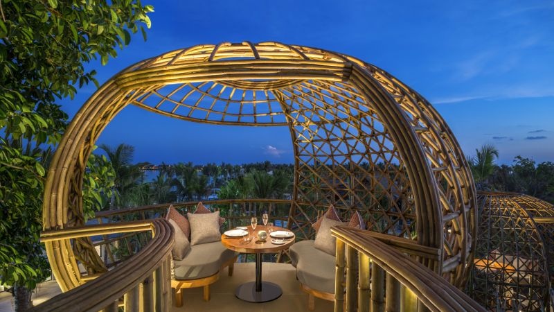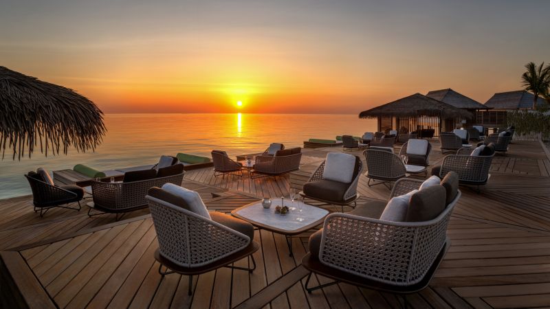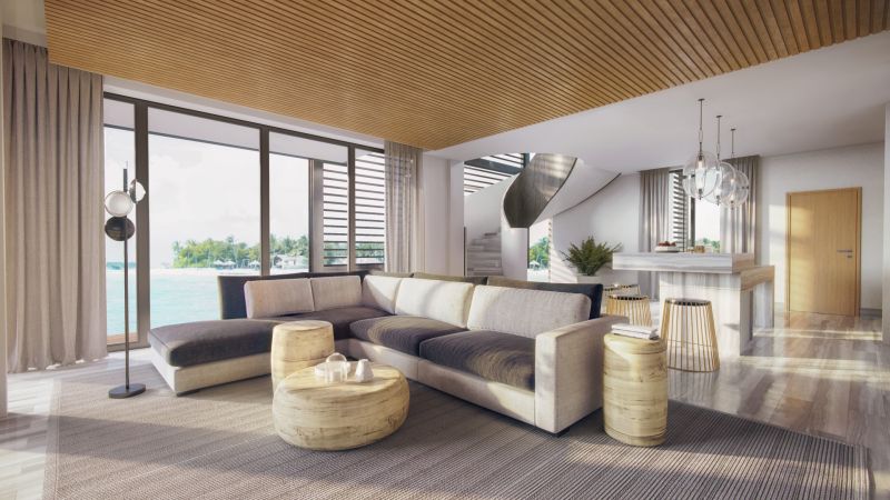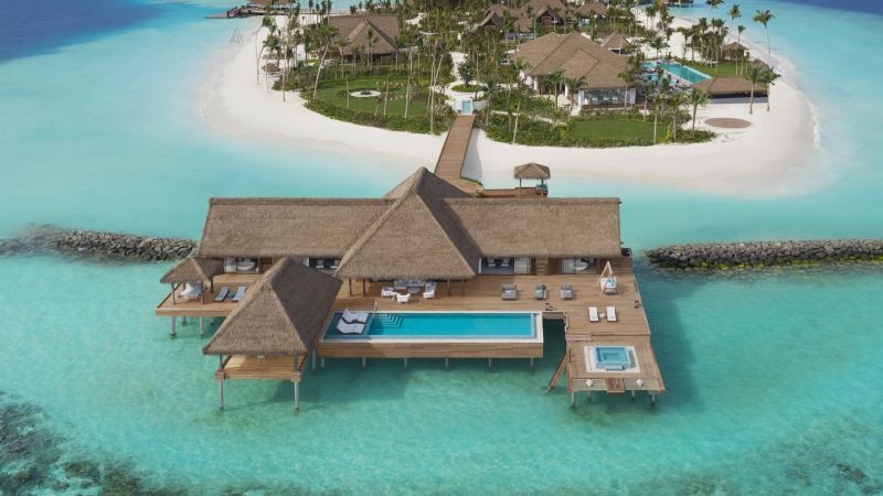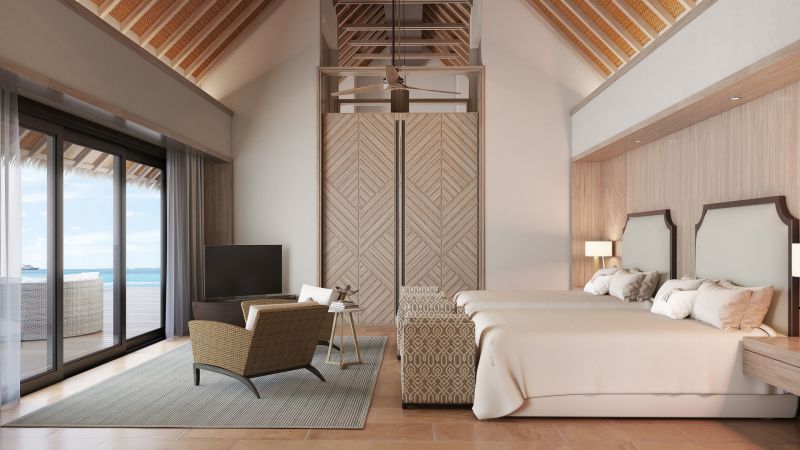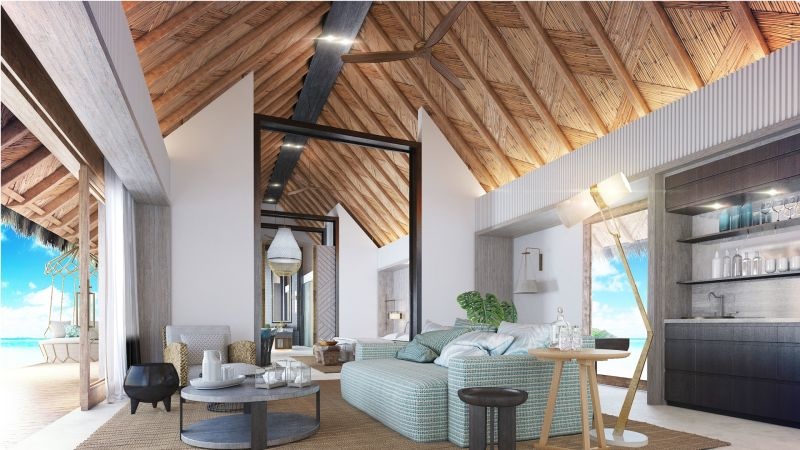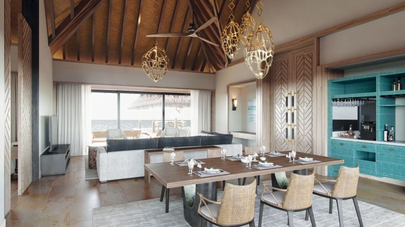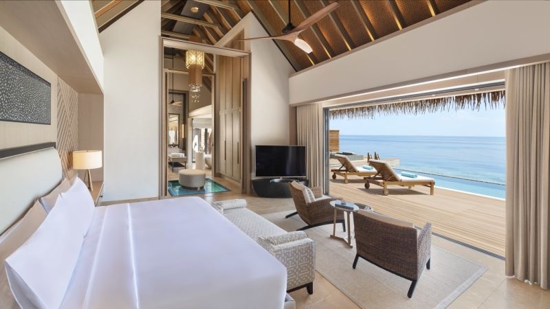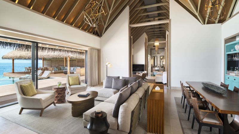 Двухуровневая расположена на сваях над водой вилла, спальня с двуспальной кроватью king-size и зоной отдыха, отдельная гостиная комната с обеденным столом, ванная комната с ванной и душем, окна от пола до потолка, 2 террасы, панорамный вид на океан, 2 террасы: на верхней палубе предлагаются услуги шеф-повара и площадка для барбекю, на нижней деревянной палубе есть собственный пейзажный бассейн, гидромассажная ванна, надводные гамаки и прямой выход к океану;