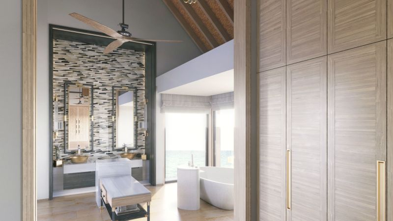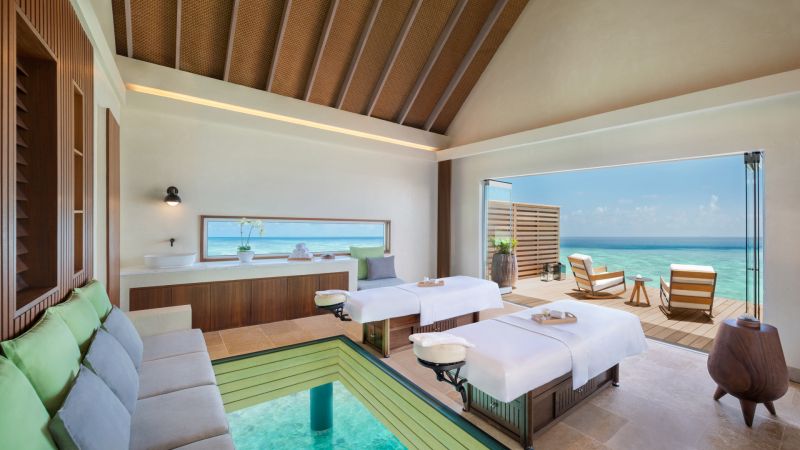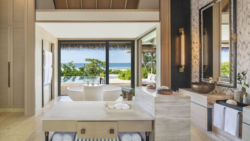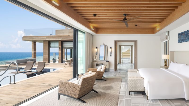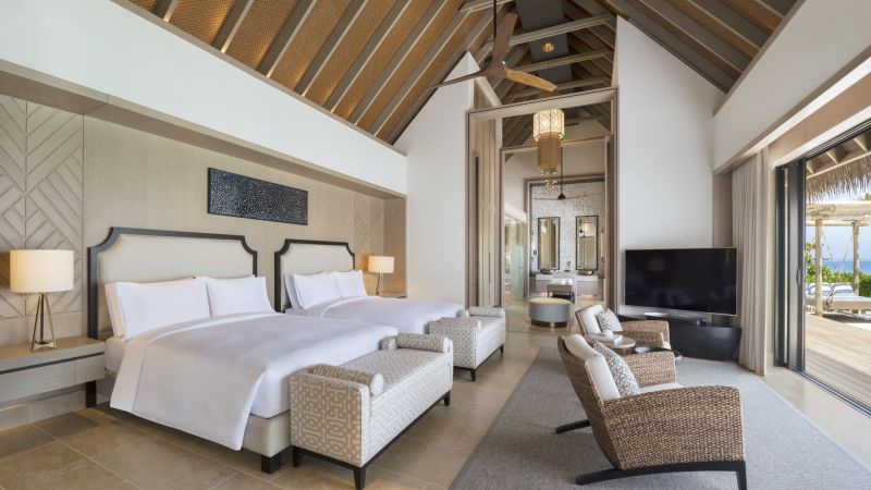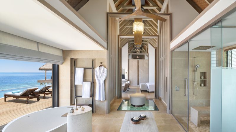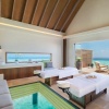 ∗ На вилле с двумя спальнями, расположившейся прямо над океаном, есть гардеробные комнаты в каждой спальне, тропический душ внутри виллы и под открытым небом, общая гостиная, панорамный бассейн и джакузи.