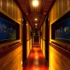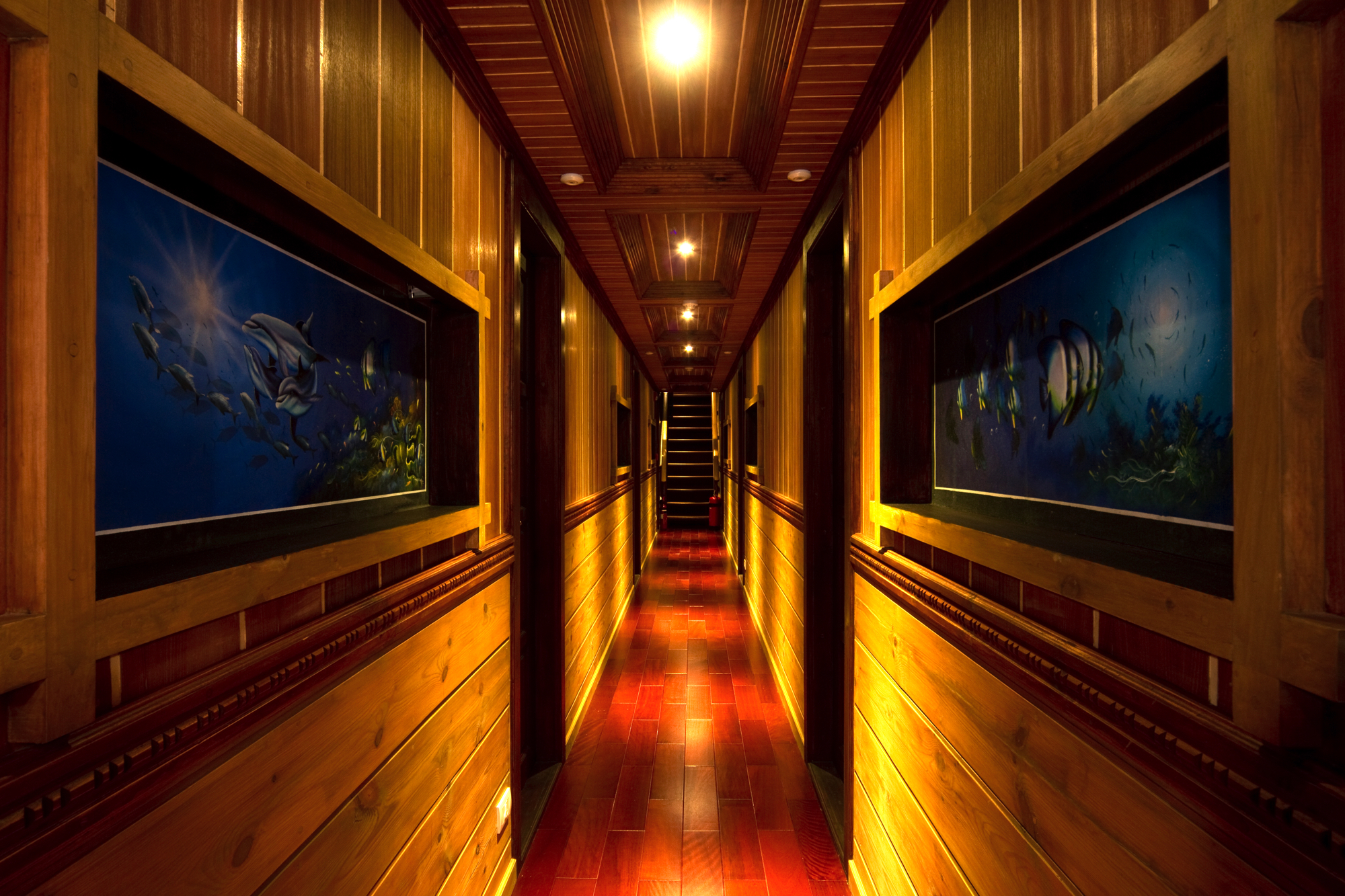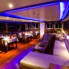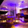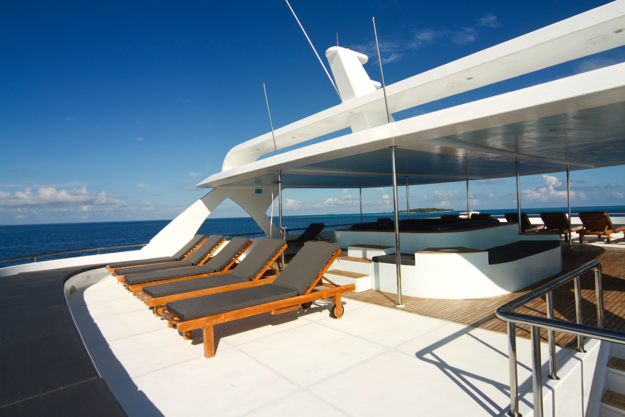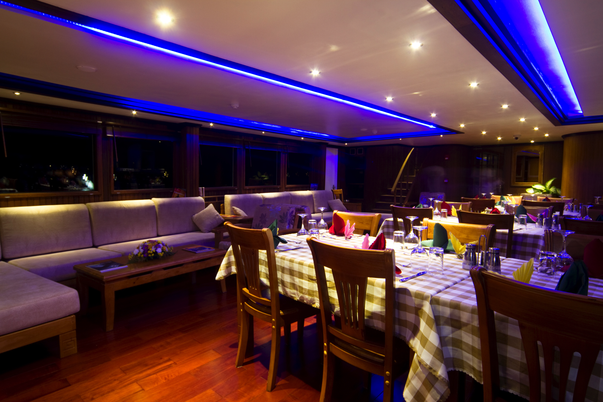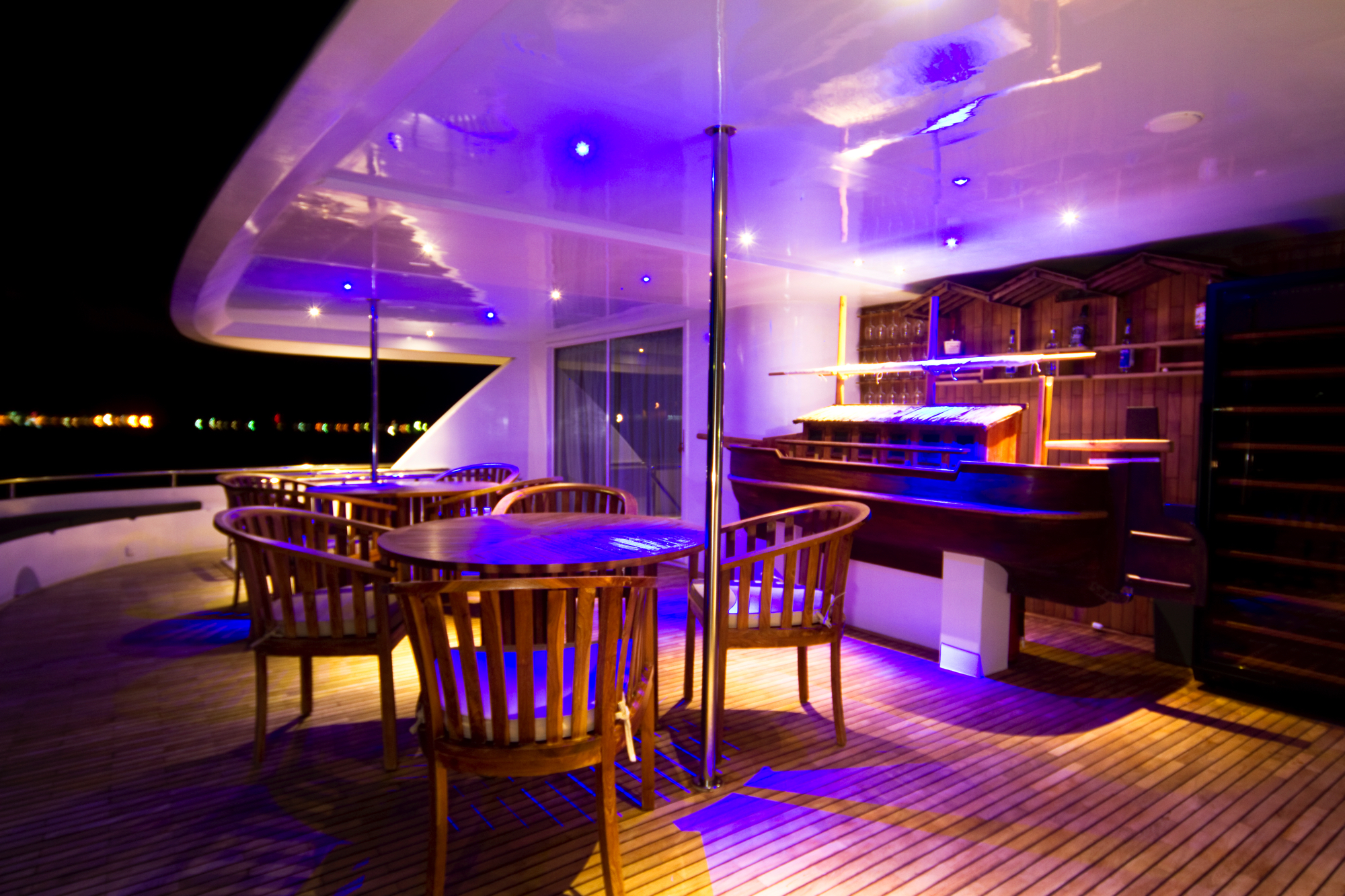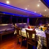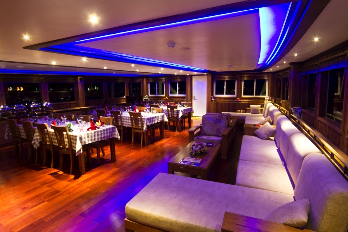 На нижней палубе – 7 просторных кают; на главной палубе расположены ресторан и зал. На верхней палубе – 4 каюты, в каждой двуспальная кровать и ванная; общая джакузи-зона с лежаками и душевыми, где могут удобно разместиться 6 человек.