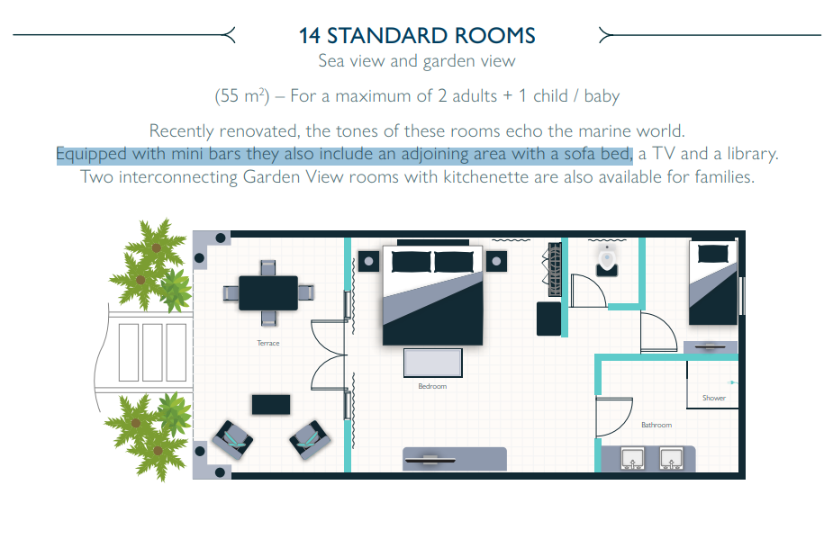 В номерах: кондиционер с индивидуальным управлением, фен, зеркало для макияжа, сейф, утюг, телевизор со спутниковыми каналами, телефон, Wi-Fi.