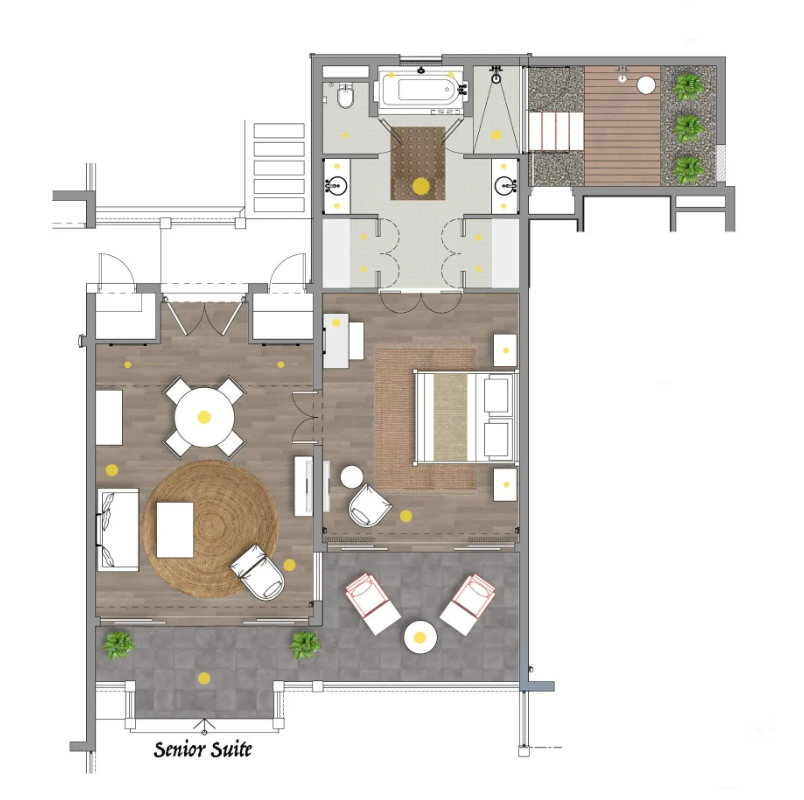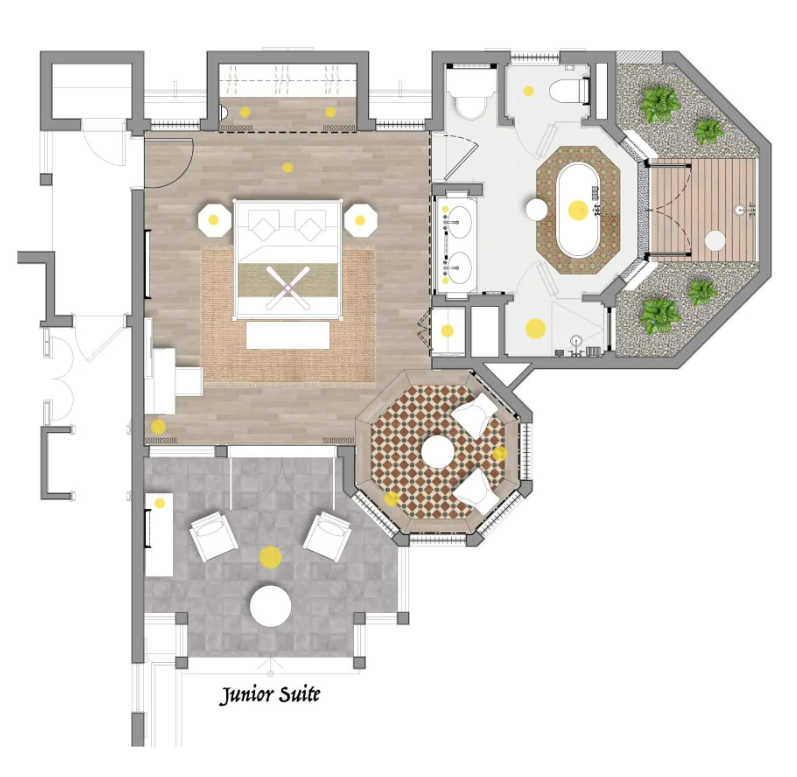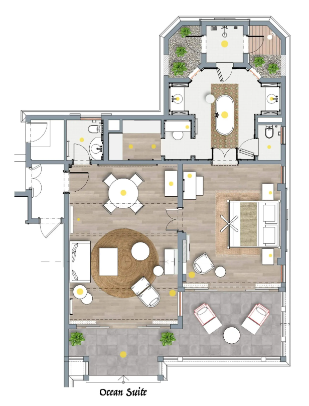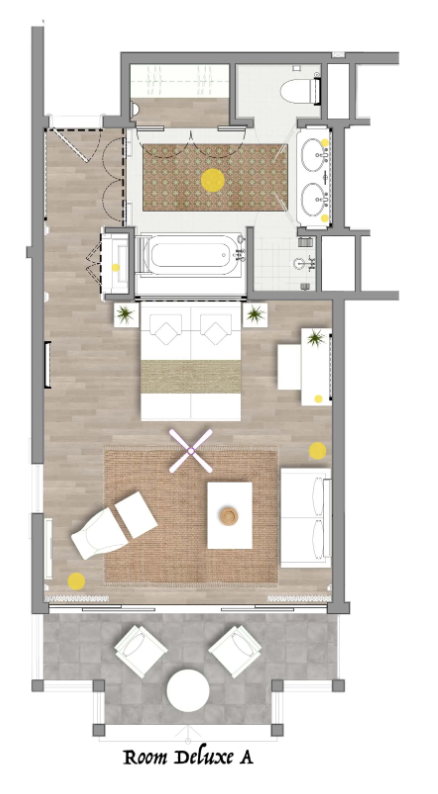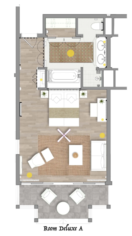 В номерах: кондиционер с индивидуальным управлением, телевизор, банные принадлежности, потолочный вентилятор, набор для приготовления чая/кофе, сейф, фен, Wi-Fi, IDD телефон, мини-бар, электрический чайник, кофемашина Nespresso с капсулами (пополняется ежедневно), халат, тапочки, утюг и гладильная доска.