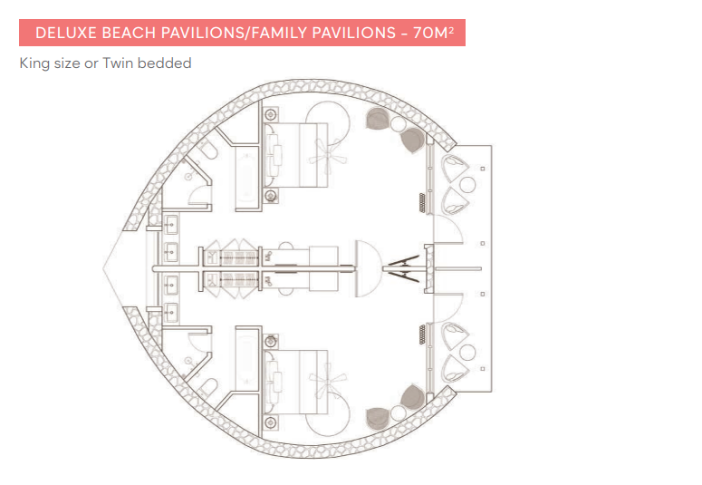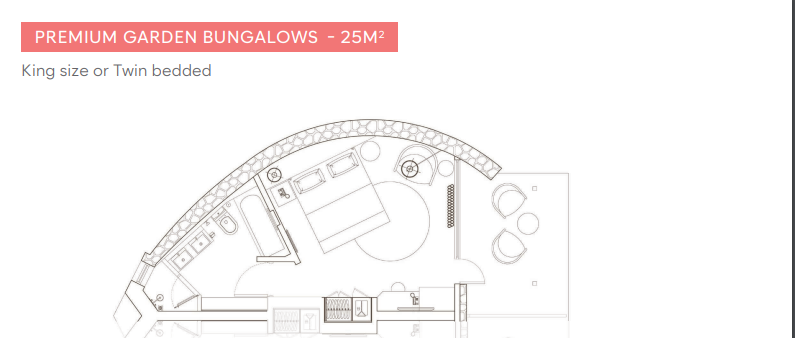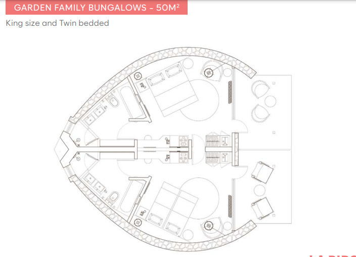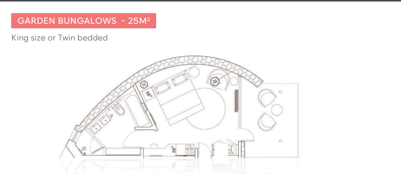 Общая площадь: 140 000 м². Отель состоит из основного двухэтажного здания и комплекса одноэтажных бунгало.